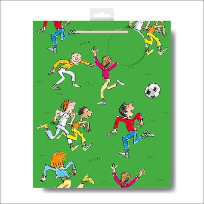 Details: This eco-friendly gift bag has been thoughtfully designed by Woodmansterne as part of their Quentin Blake range. Featuring cartoon boys kicking a football on a green pitch this gift bag is bound to make a special someone feel like the man of the match!