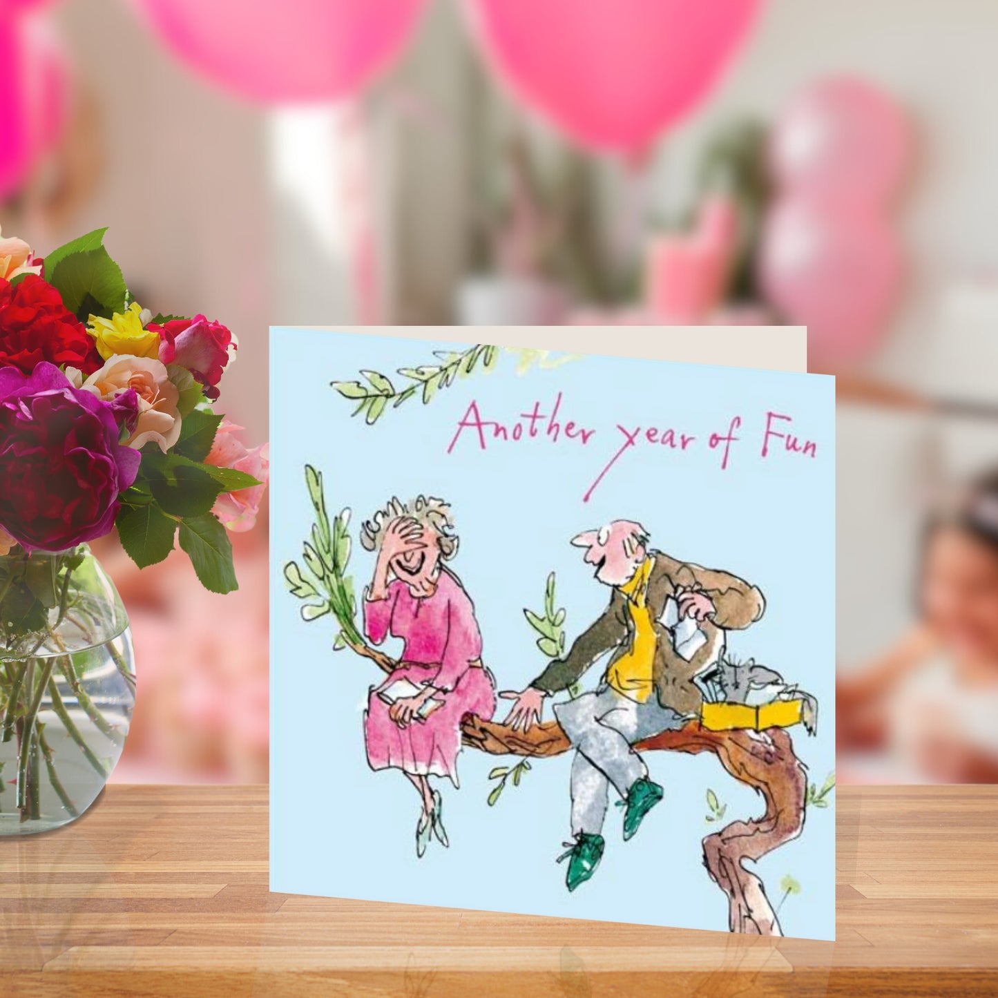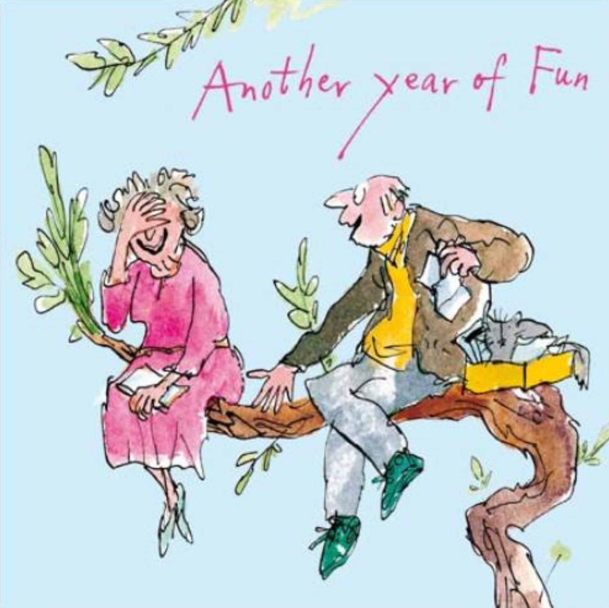 Details: A popular greeting card from Britain's best-loved illustrator Quentin Blake. A fun, bright and contemporary card printed and published in the UK featuring an elderly couple giggling and sitting on a tree branch