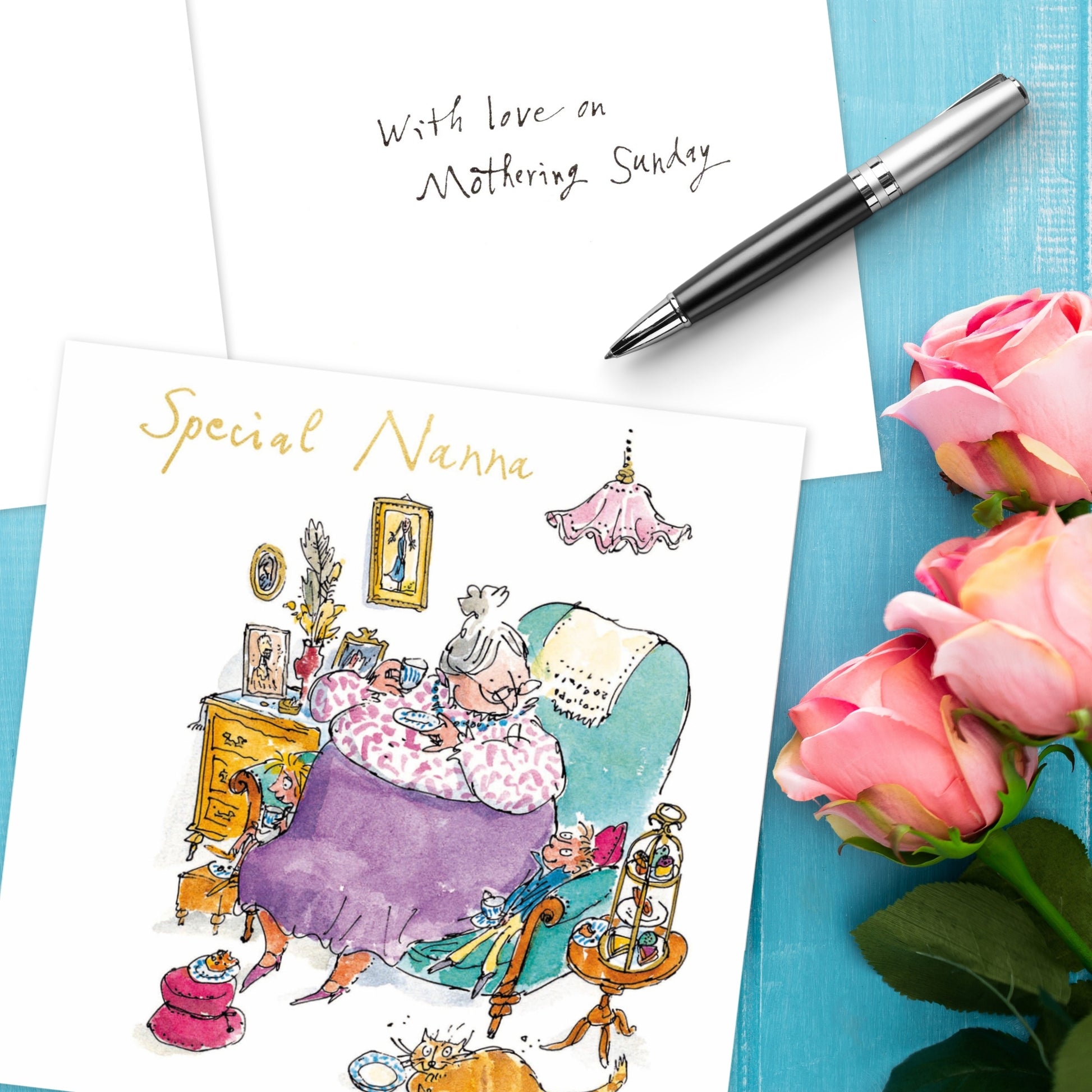 Looking for a Mother's Day card for your Nan? Grandmothers deserve to be celebrated on Mother's Day as well, and this Quentin Blake greeting card is a perfect choice! Its illustration of a cosy afternoon tea shared between Nanna and the sofa humorously captures your cherished moments spent together.