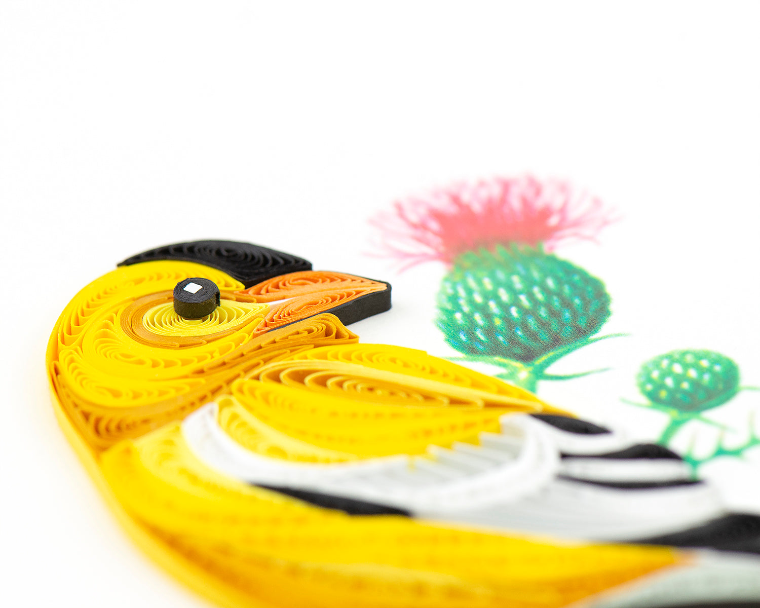 Looking for greeting card ideas for someone special? Capture your feelings with this stunning quilled card featuring a vibrant goldfinch perched on a thistle. A gift that speaks volumes and leaves a lasting impression on that special someone in just one glance.