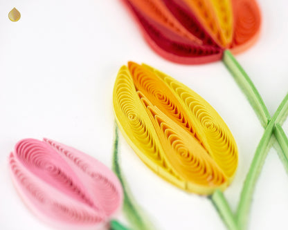 Looking for greeting card ideas for someone special? Capture love with this delicate quilled greeting card, featuring colourful tulips that surprise and delight. Send someone special your love and admiration with this heartfelt bouquet, bursting with vibrant hues that will brighten their day.