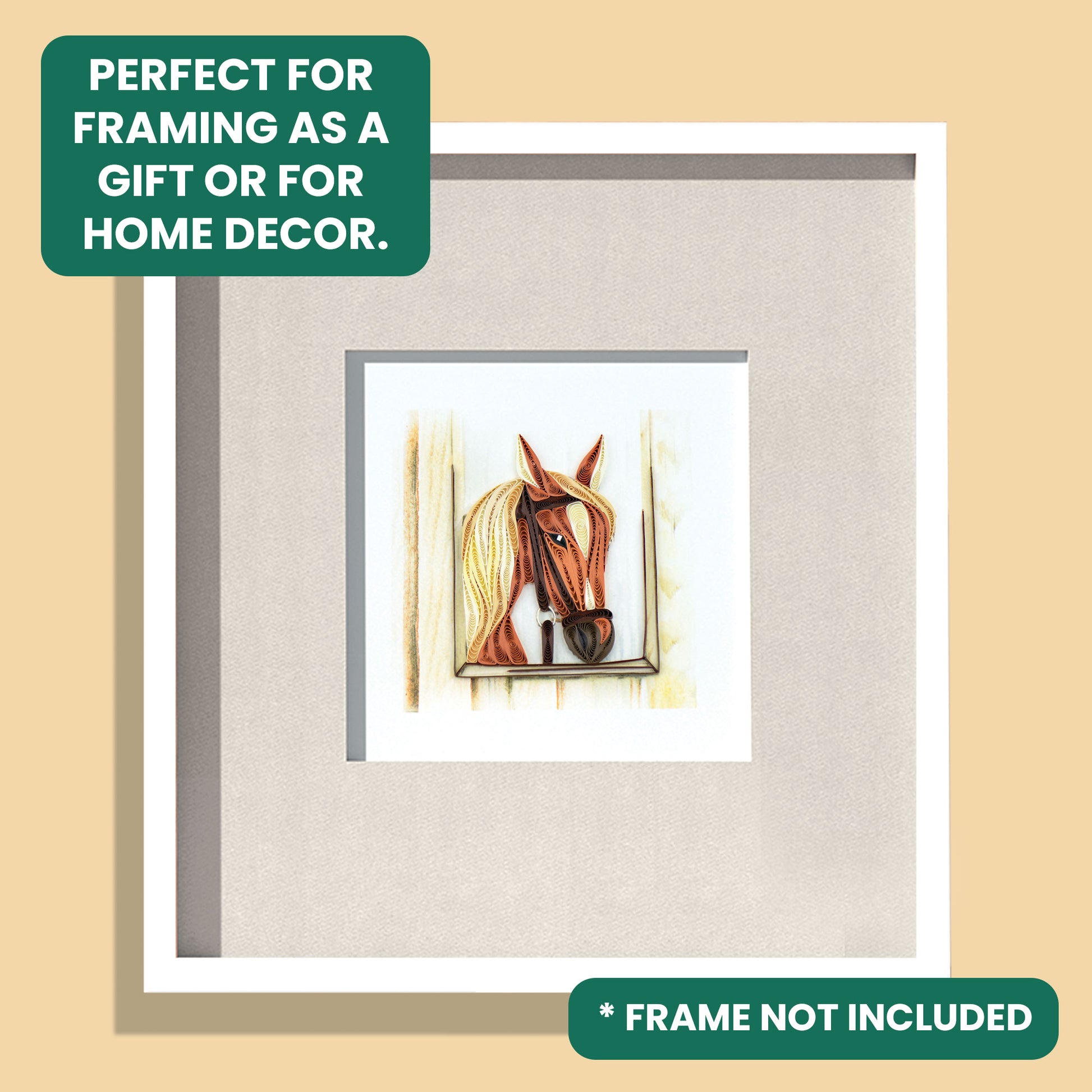 Details: Celebrate the beauty of horses with this stunning quilled card from Second Nature. Complete with intricate detailing, this hand-finished design features a horse in its stable and is the perfect way to make your loved ones feel special.