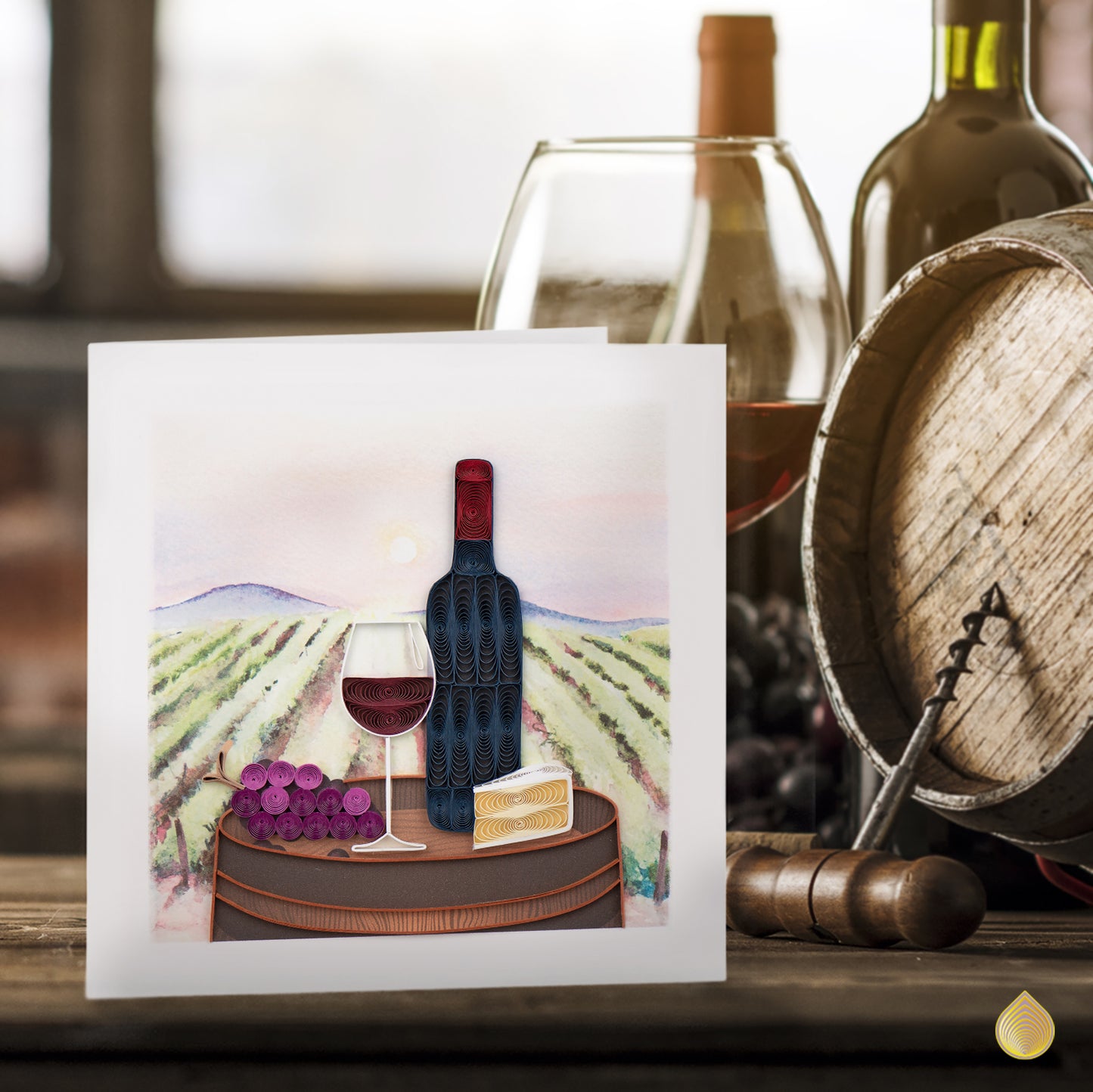 Looking for greeting card ideas for someone special? Capture your gratitude and appreciation with this vibrant quilled greeting card, featuring the perfect pairing of red wine, cheese, and grapes. Surprise that special someone with a heartfelt message, letting them know that they are cherished and loved.