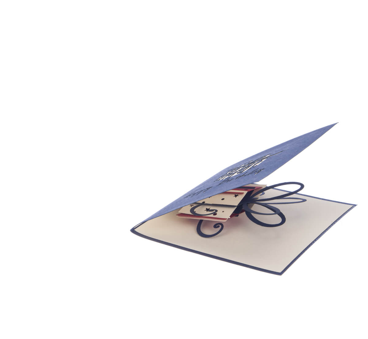 Details: It truly is what's inside that counts, each one of these Cardology 3D pop up cards hides a surprise intricate die-cut pop out inside. The Red & Navy Gift Box card features a delicate laser-cut gift box with 'Happy Birthday' wording design on the front of the card and displays a hand-crafted magnificent and pretty red & navy gift box on the inside once opened. Each card comes flat with an envelope included Closed