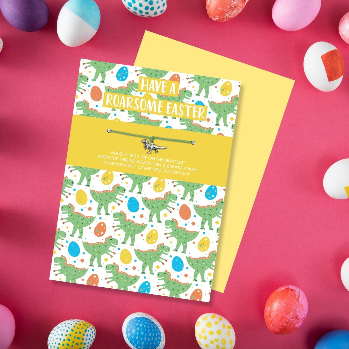 Details: Make Easter extra special with Second Nature's Cards 'n' Wishes range. This roarsome Easter card features fun dinosaurs and multicoloured eggs, guaranteed to put a smile on someone's face. Wearable and joyful, this combo is the perfect gift for the occasion.