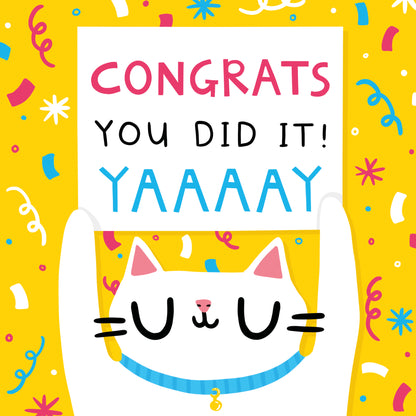 Details: This eco-friendly Funny Card has been thoughtfully designed by Scribbler. Featuring a cat holding up a congratulation sign with the caption 'CONGRATS YOU DID IT! YAAAAY', this card is bound to make a special someone feel celebrated.