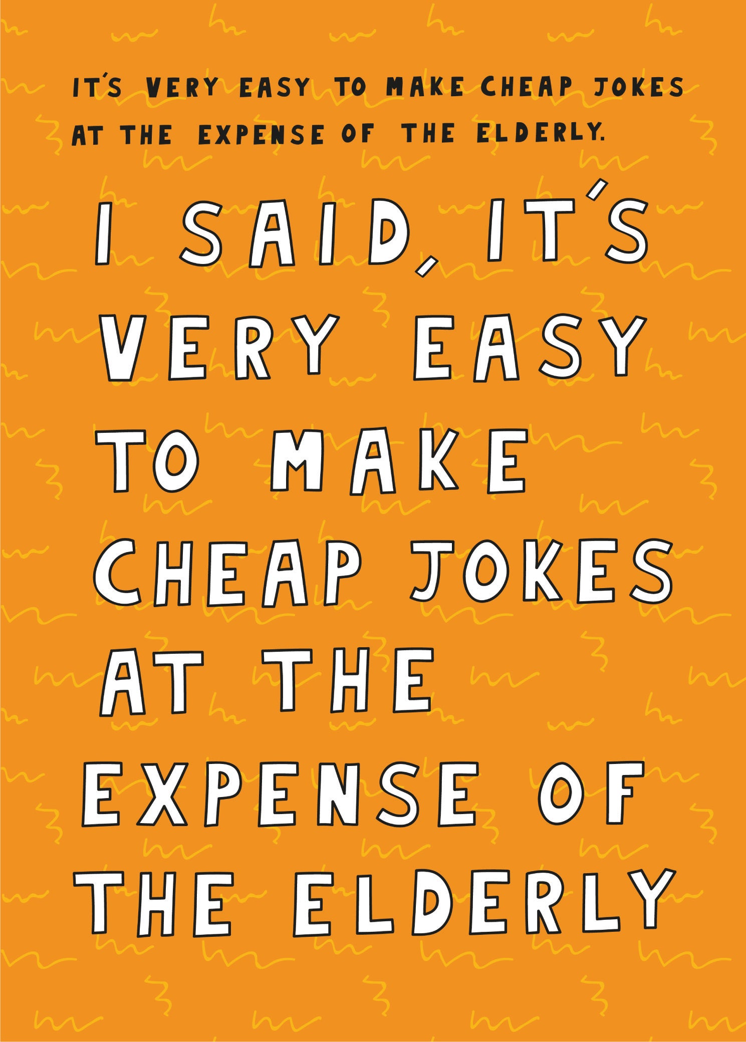 Details: This eco-friendly Funny Card has been thoughtfully designed by Scribbler. Featuring a joke about their hearing as they get older with the caption 'IT'S VERY EASY TO MAKE CHEAP JOKES AT THE EXPENSE OF THE ELDERLY. I SAID, IT'S VERY EASY TO MAKE CHEAP JOKES AT THE EXPENSE OF THE ELDERLY', this card is bound to make a special someone smile.