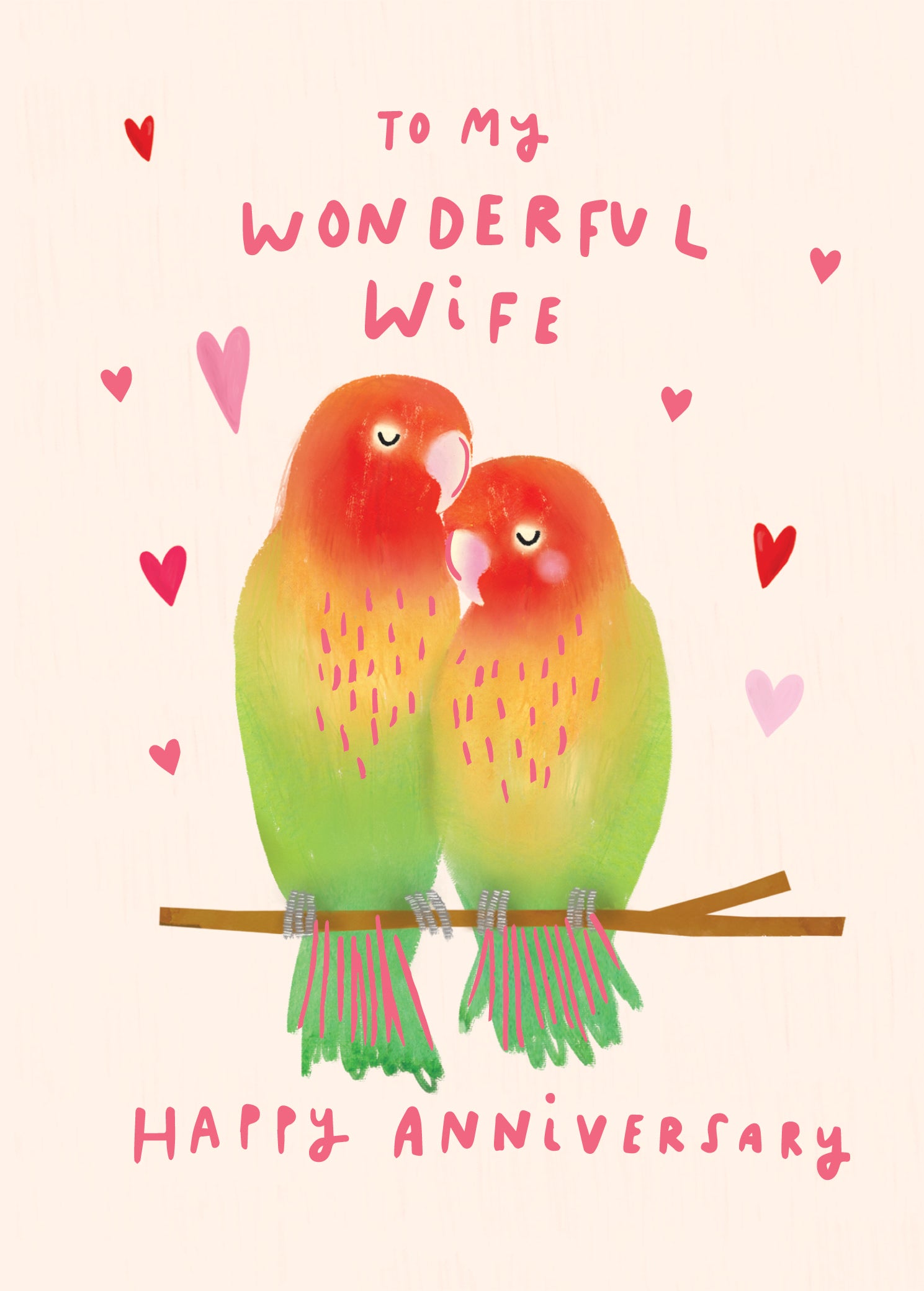 Looking for greeting card ideas for her? A Scribbler Happy Anniversary Wonderful Wife Lovebirds Forever! Greeting Card would make someone feel loved and cherished on their anniversary. This colourful eco-friendly card showcases a pair of vibrant parrots cuddling, making it a delightful surprise for a special Wife.