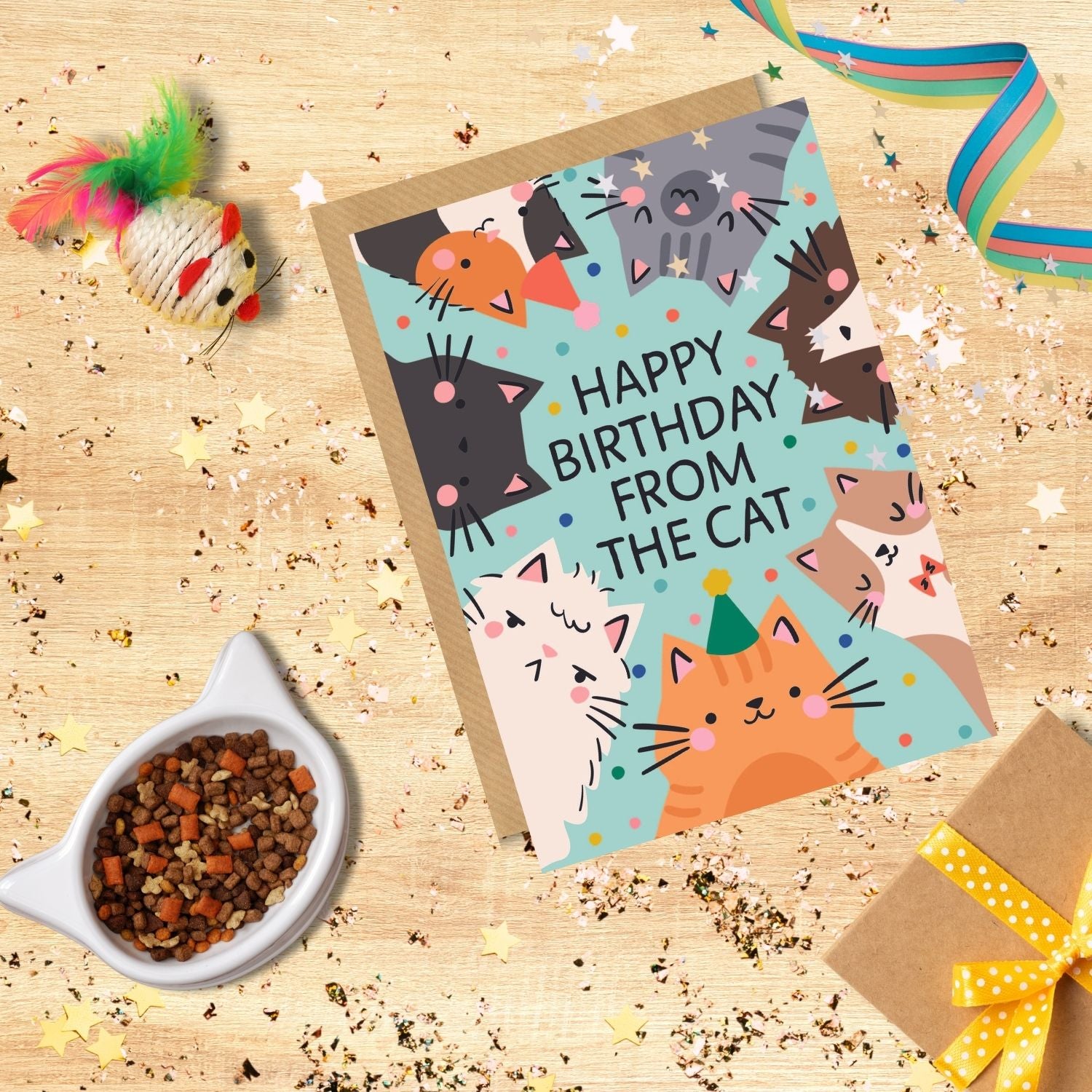 Details: This greeting card from the Scribbler range features a playful and eco-friendly design, perfect for pet parents. The card showcases various cats donning party hats and reads 'HAPPY BIRTHDAY FROM THE CAT.' A thoughtful way to show someone you care on their special day.