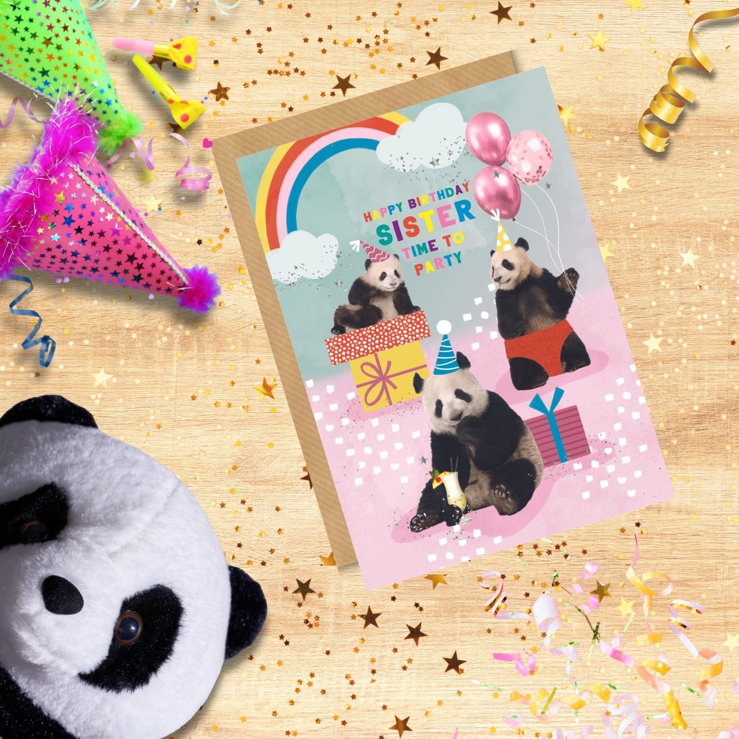 Details: This eco-friendly Funny Card has been thoughtfully designed by Scribbler. Featuring pandas celebrating a birthday party with the caption 'HAPPY BIRTHDAY SISTER TIME TO PARTY', this card is bound to make a special Sister smile.