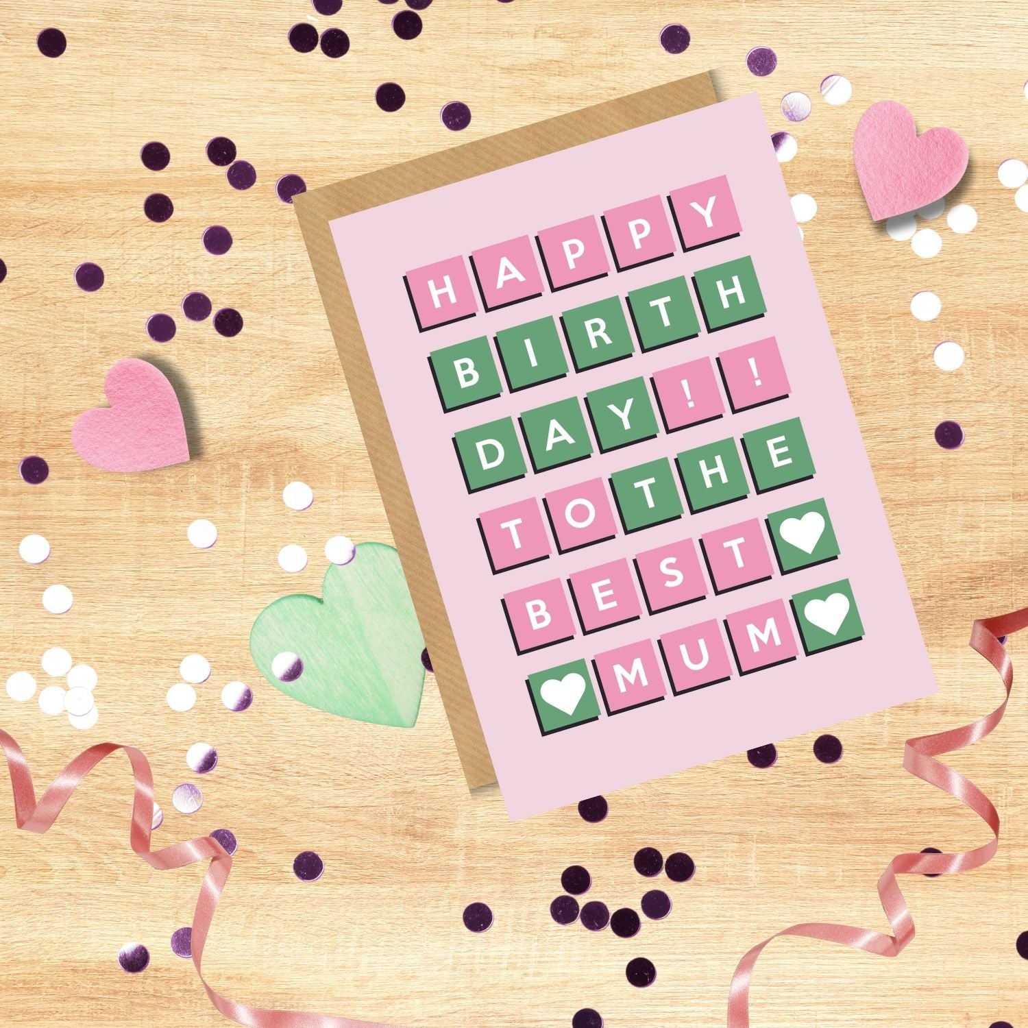 Looking for greeting card ideas for Mum? This playful eco-friendly greeting card is the perfect way to surprise a special Mum on her birthday. With its adorable illustration of scrabble lettering saying 'happy birthday to the best mum', it captures the love we have for our mothers in a fun and heartfelt way.
