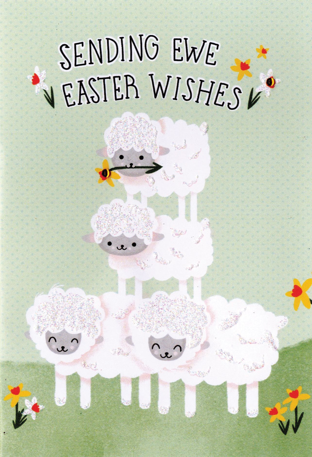 Details: A lovely hand-finished, glitter-embellished Easter greeting card by Second Nature featuring cartoon sheep on top of each other