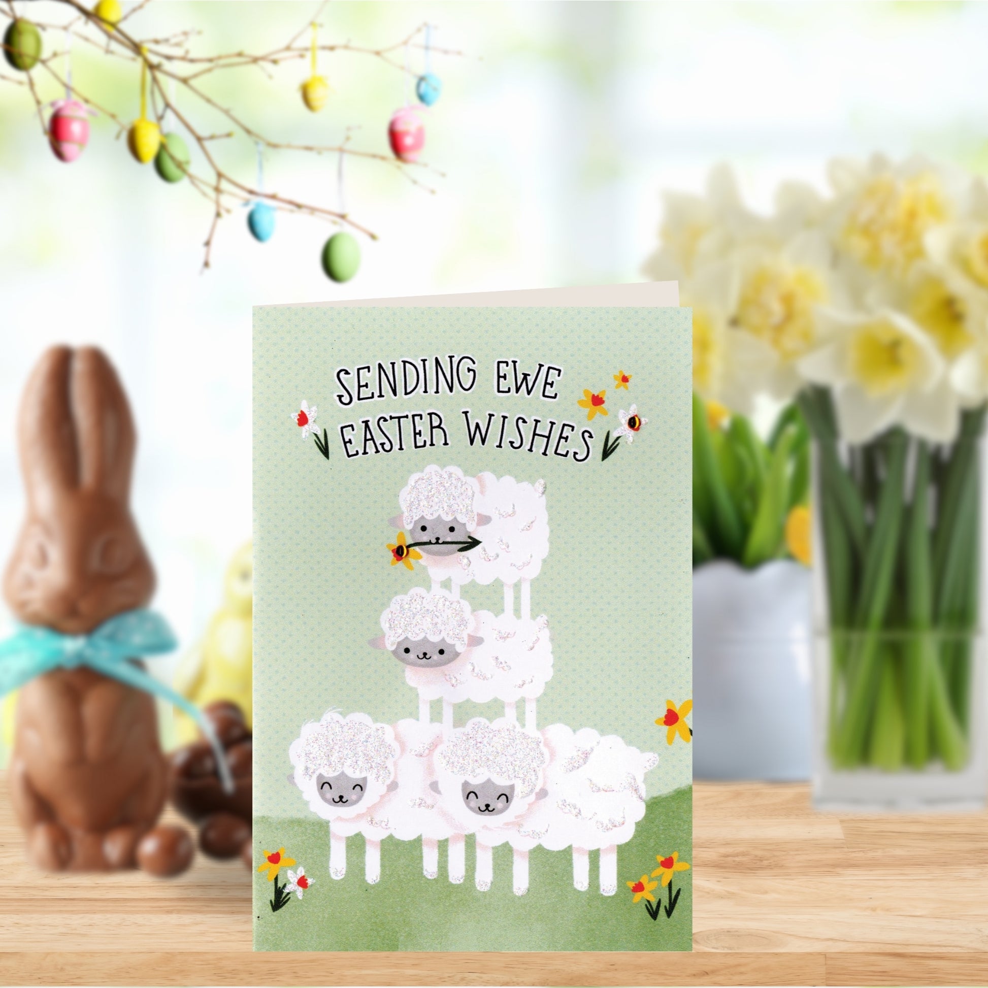Looking for a delightful way to spread joy this Easter? This charming, glitter-embellished card featuring adorable cartoon sheep brings a heartfelt message of fun and is perfect for a lighthearted Easter card.