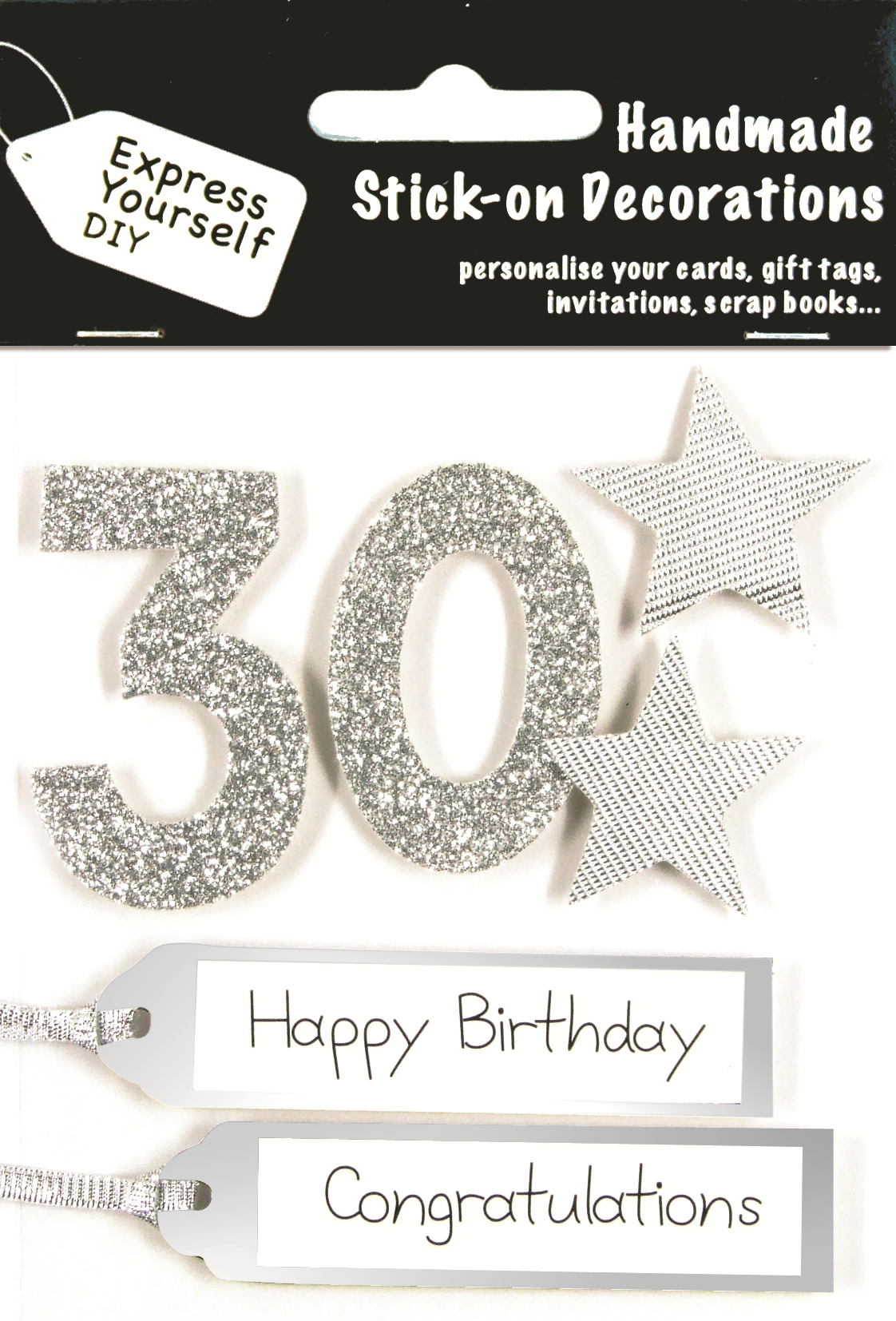 Details: A gorgeous range of glitter finished stick on adhesive toppers from the popular Express Yourself DIY Range. Toppers are the perfect way to personalise a greeting card and may also be used for invitations, gifts, gift tags, scrap books and much more besides. They are easy to use, they simply stick on.