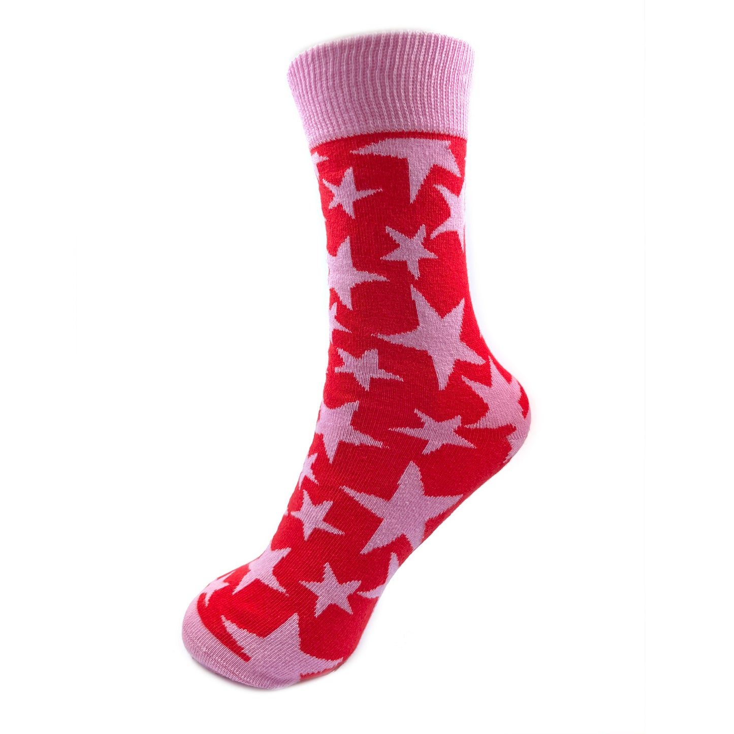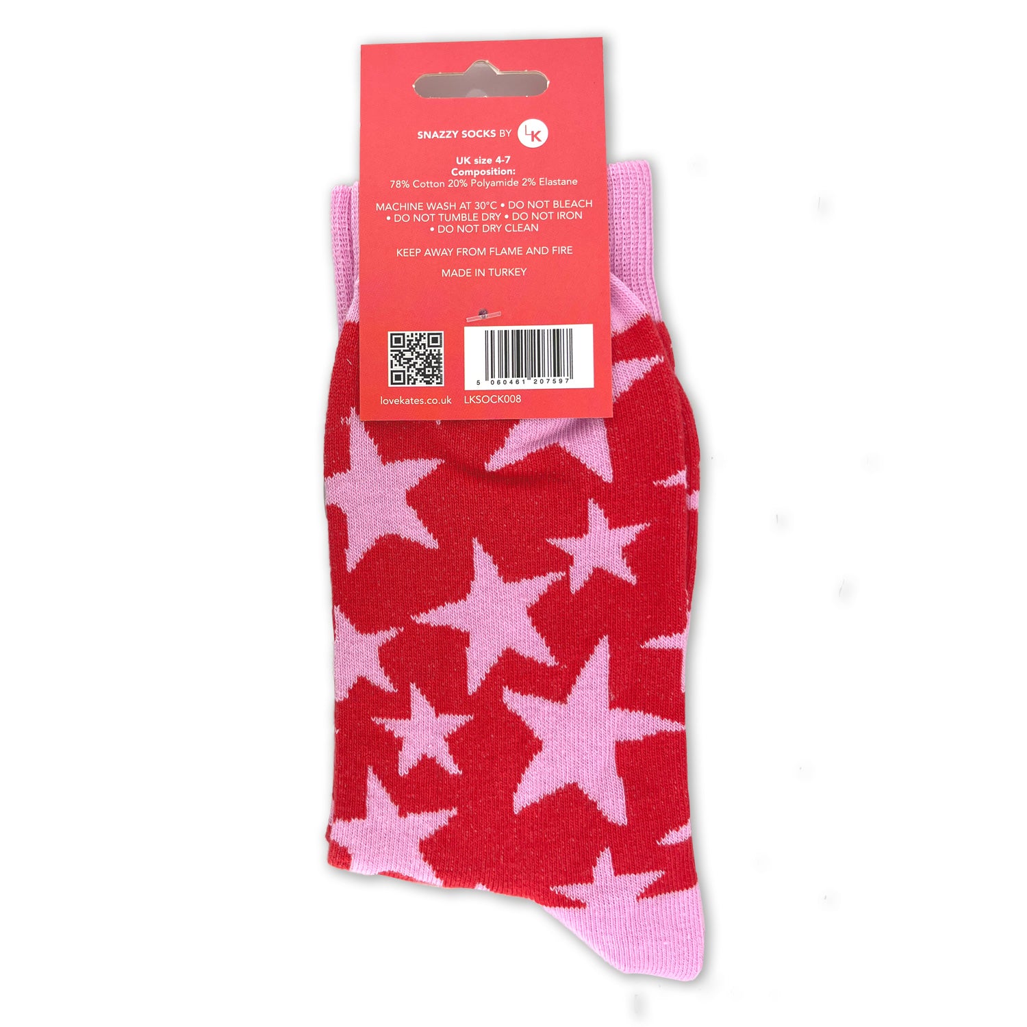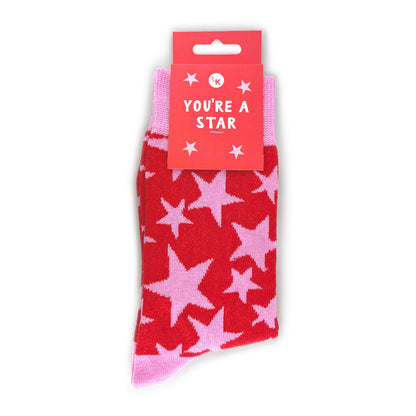 Details: This star-studded pair of socks from Love Kate's Snazzy Socks range features an all over pink star design on a vivid red background with light pink toes and heels and the caption 'You're A Star'.