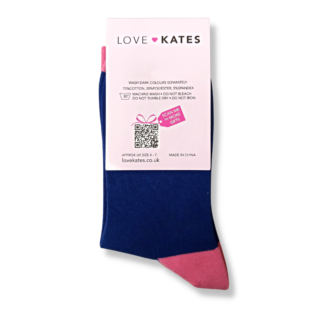 Details: A fun pair of blue and pink socks from our Love Kate's Snazzy Socks range with You're My Rainbow and a magical rainbow on the side and coordinating colours at the toe, heel and ankle. Each sock contains 75% cotton, 20% polyester and 5% spandex.
