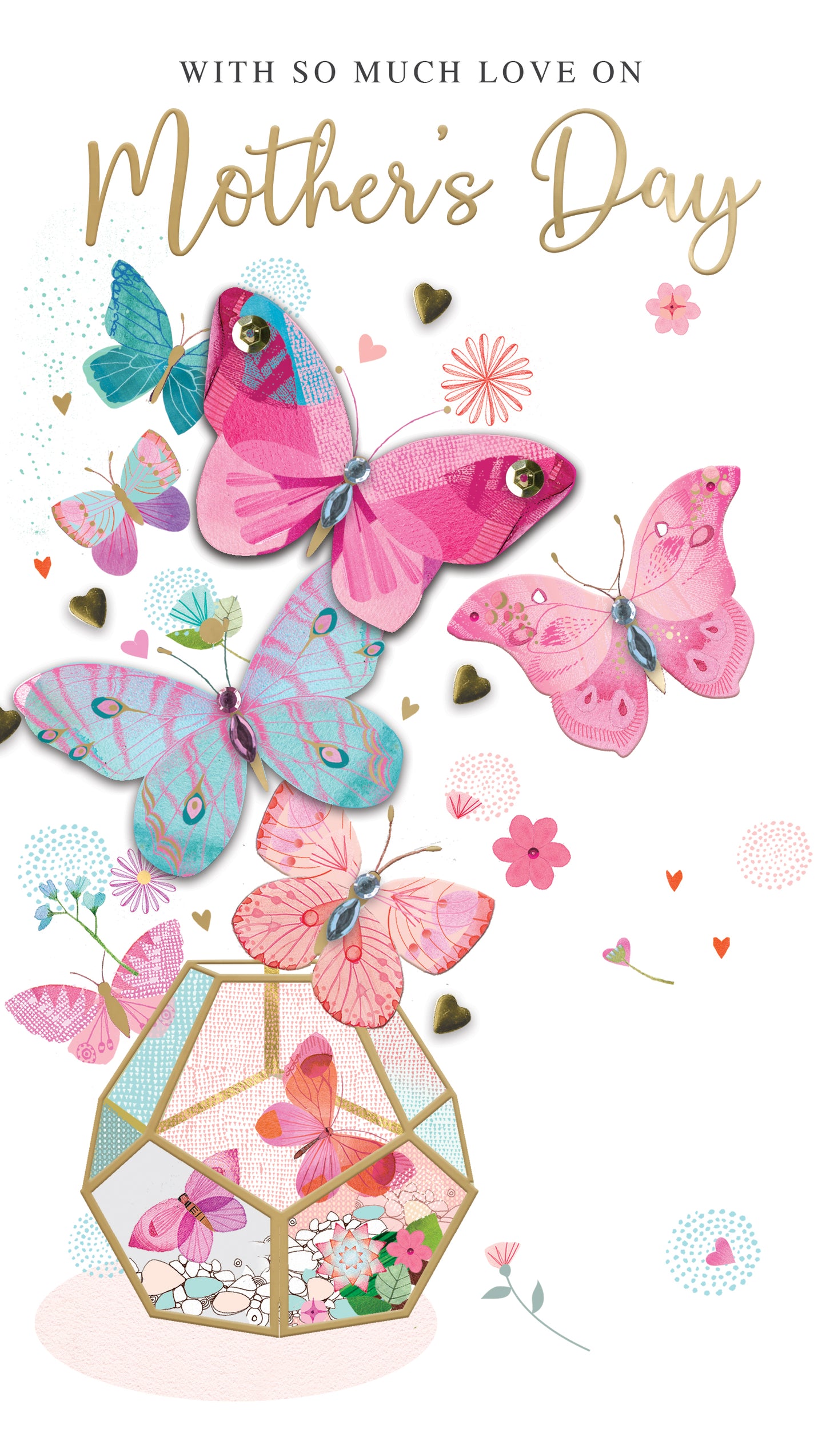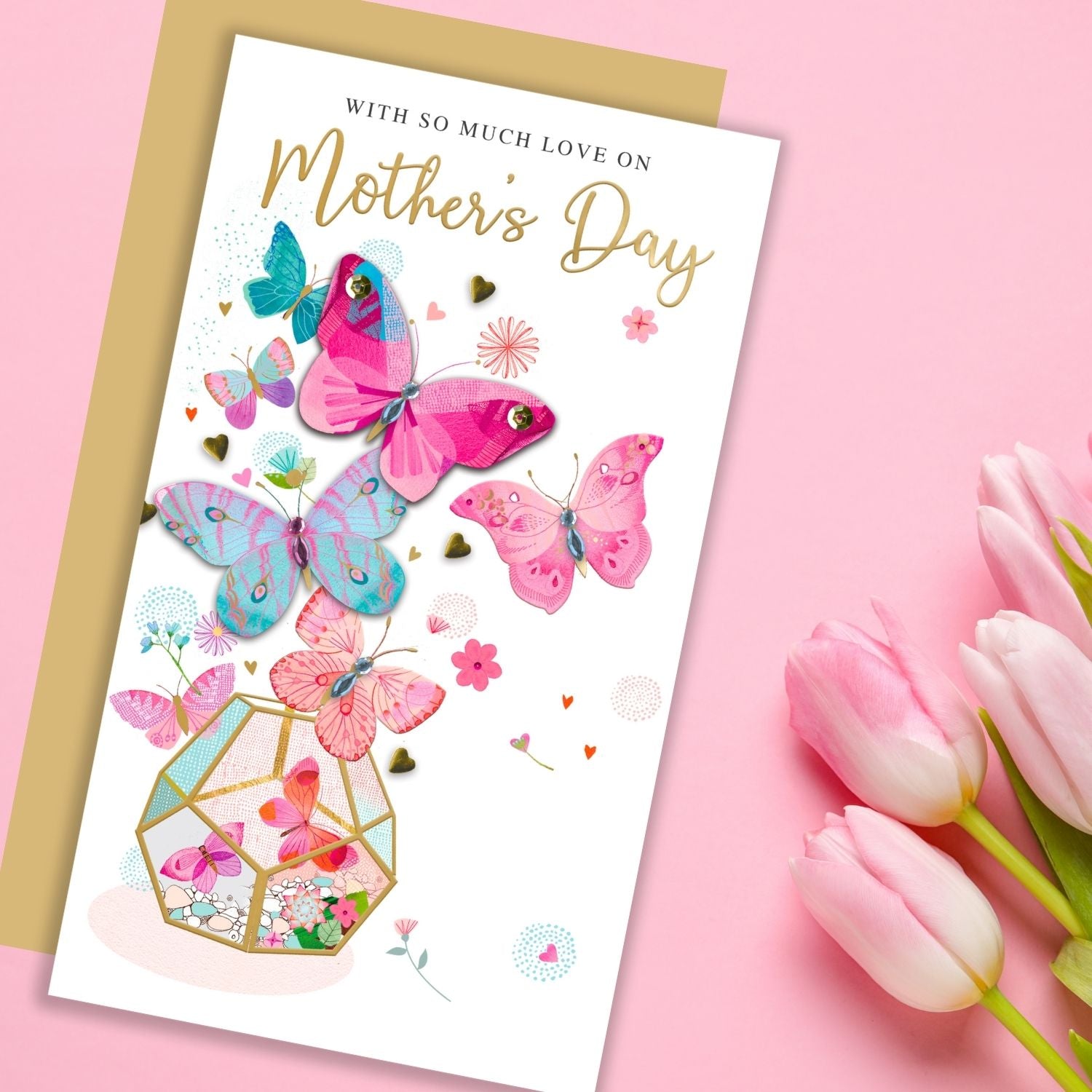 Details: Celebrate Mother's Day in style with this beautiful handmade card from Second Nature's Champagne range. Adorned with embellished flowers and butterflies, the heartfelt caption 'With So Much Love On Mother's Day' adds a personal touch to this special gift. Perfect for showing your appreciation to the special woman in your life.