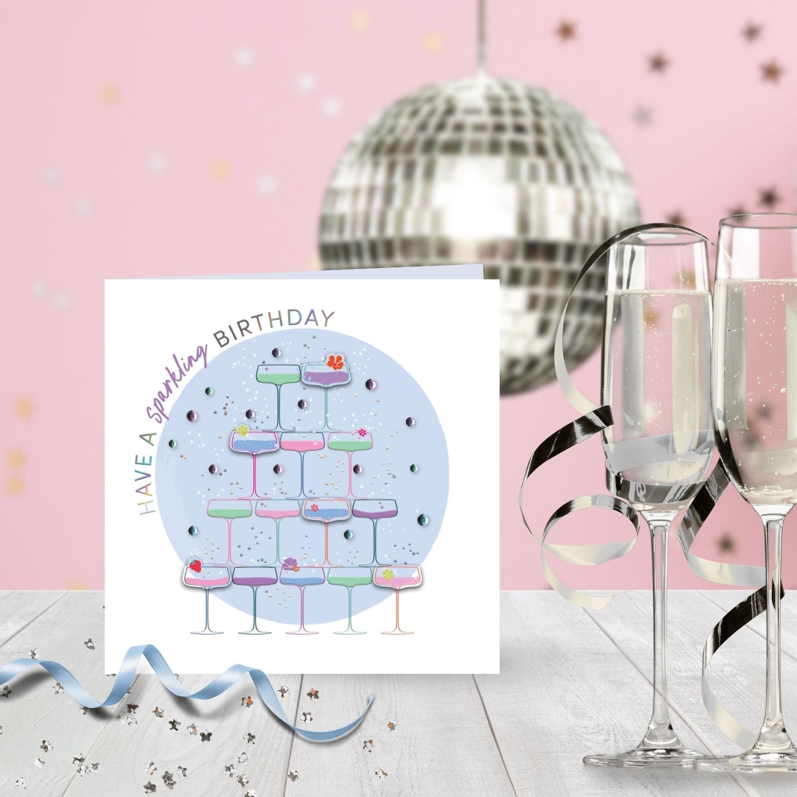 Details: This luxurious hand-finished card features a charming tower of champagne glasses filled with pastel bubbles against a pale blue background. Adorned with sparkling silver foil and gemstone accents, it conveys a celebration message, "Have A Sparkling Birthday," making it a delightful choice for celebrating special occasions in style.
