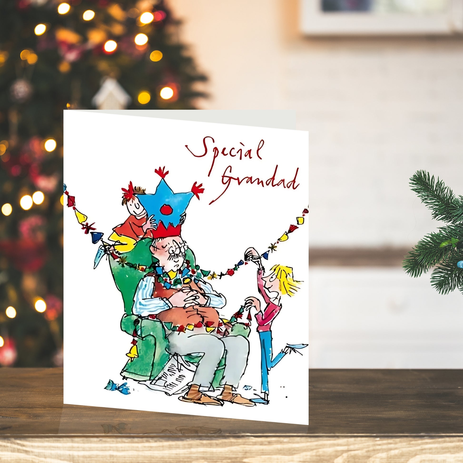 Details: A popular greeting card from Britain's best-loved illustrator Quentin Blake featuring a charming and festive illustration of a peaceful grandad being decorated by his grandchildren in paper garlands