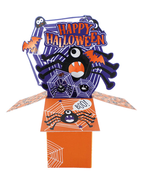 Details: This cleverly designed pop up card from Second Nature's Clever Cubes range features a spooky spider caught in a sticky web with the message 'Happy Halloween'. The 3D design is sure to impress and bring joy to any recipient.