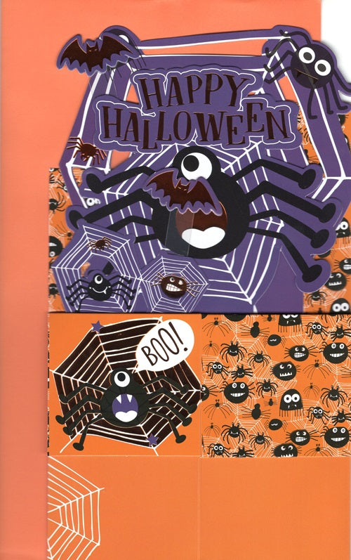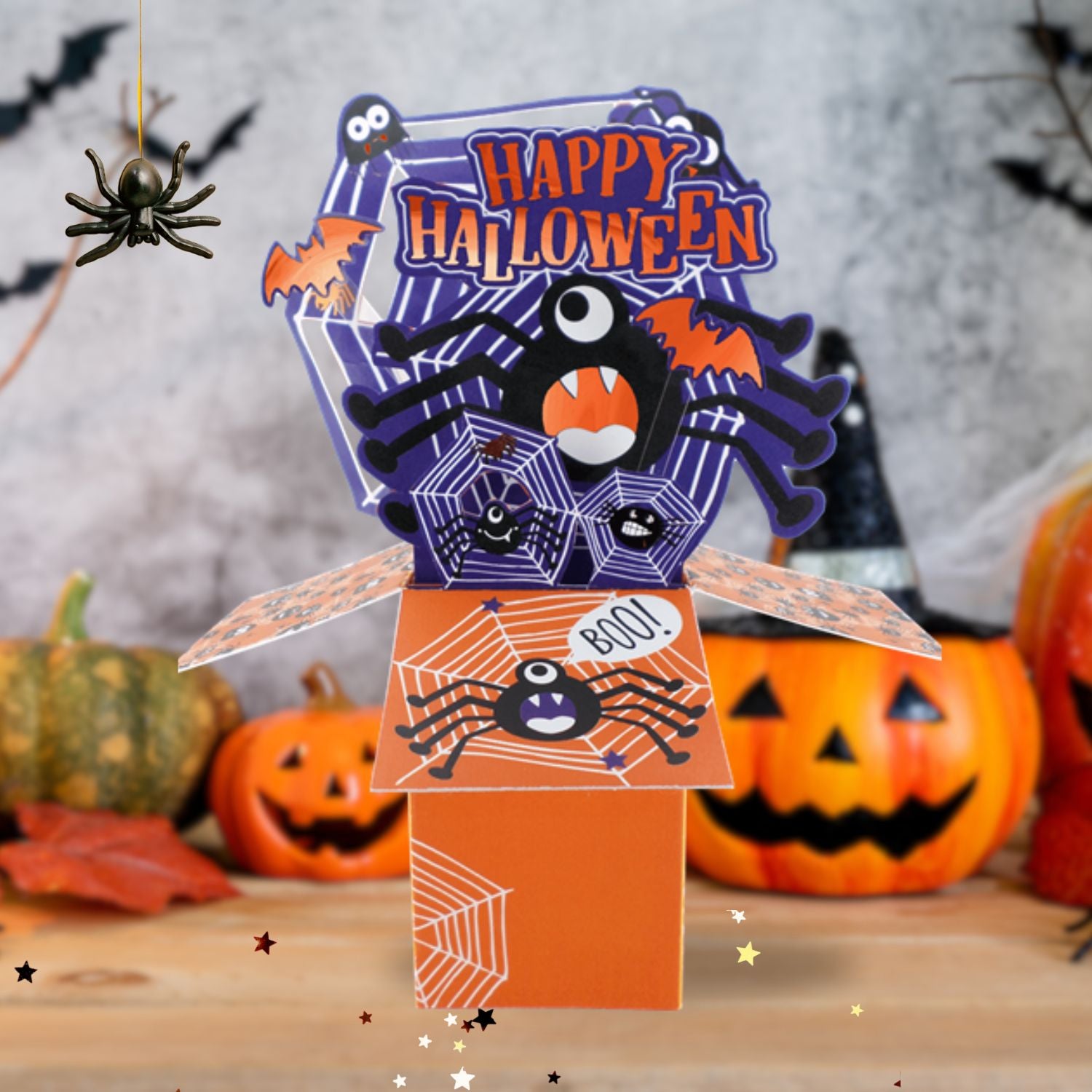 Looking for greeting card ideas for Halloween? With its vibrant design and captivating 3D effect, this Halloween card brings joy and surprise to its recipient. Featuring a creepy spider lurking in an intricate web, it conjures a spine-tingling thrill while delivering joy and surprise, making it the perfect way to delight and spook someone special.