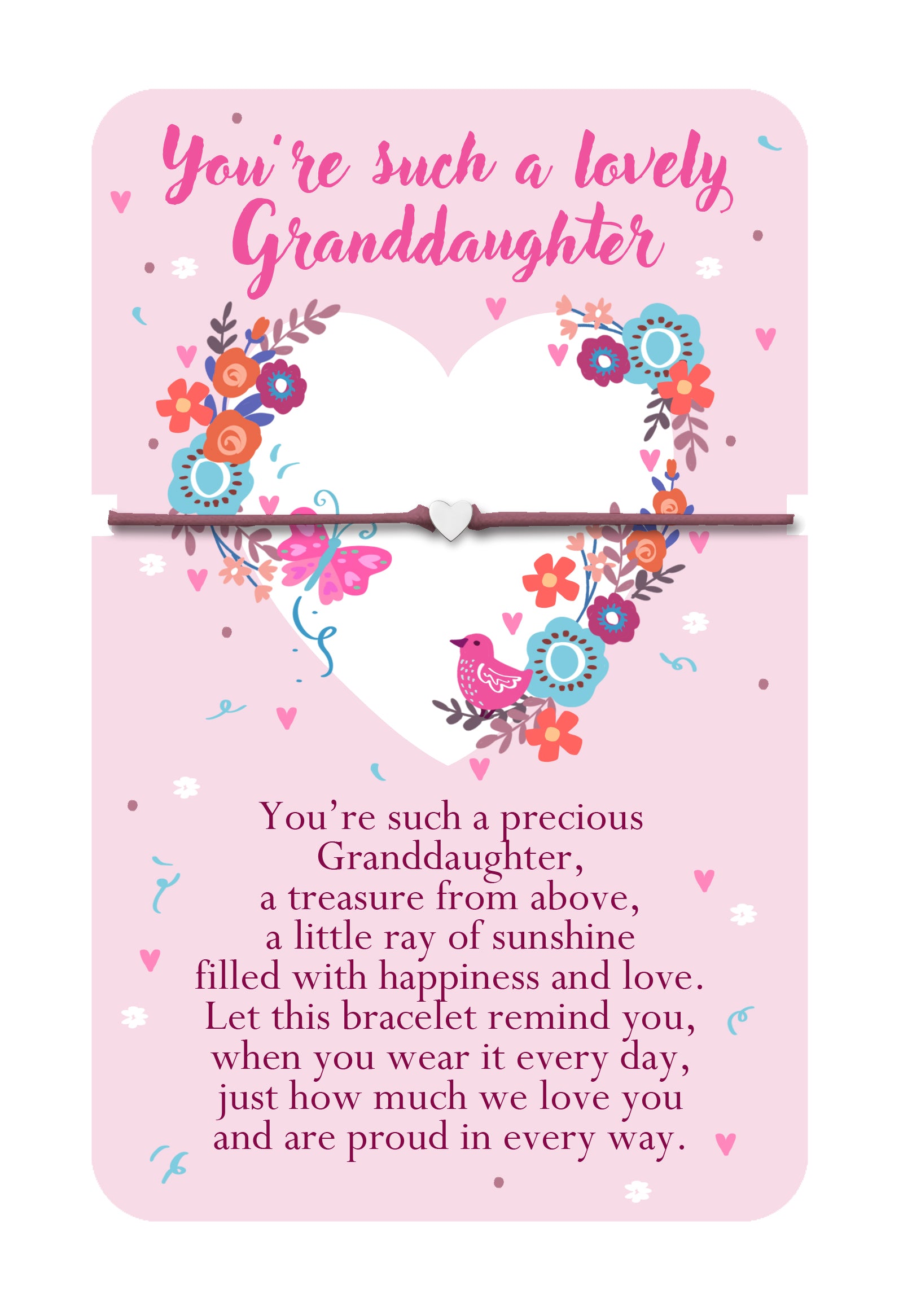 Details: You're such a precious Granddaughter, a treasure from above, a little ray of sunshine filled with happiness and love. Let this bracelet remind you, when you wear it every day, just how much we love you and are proud in every way.