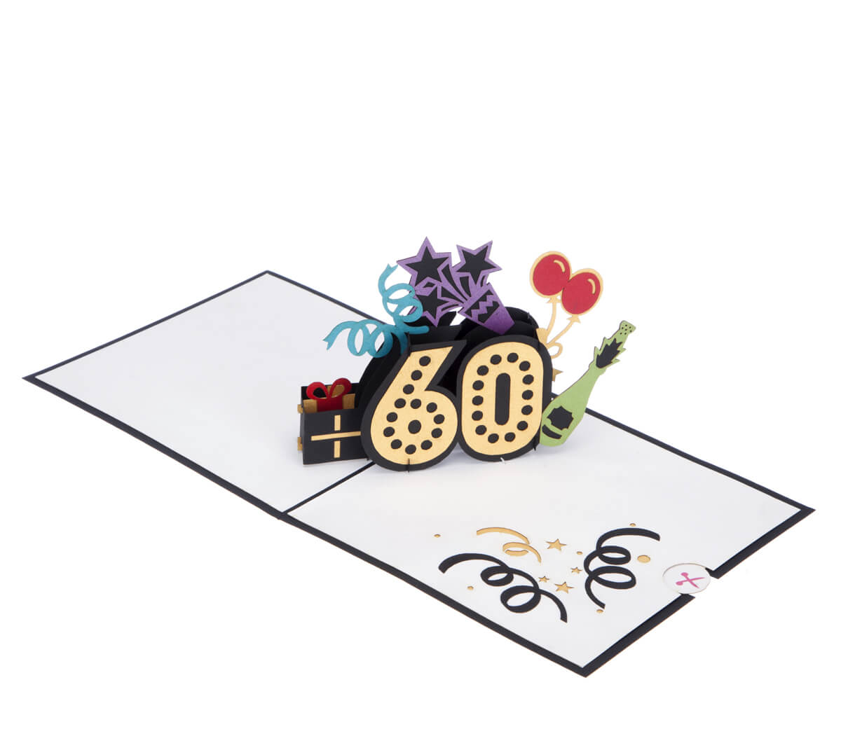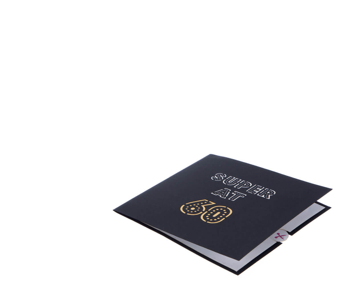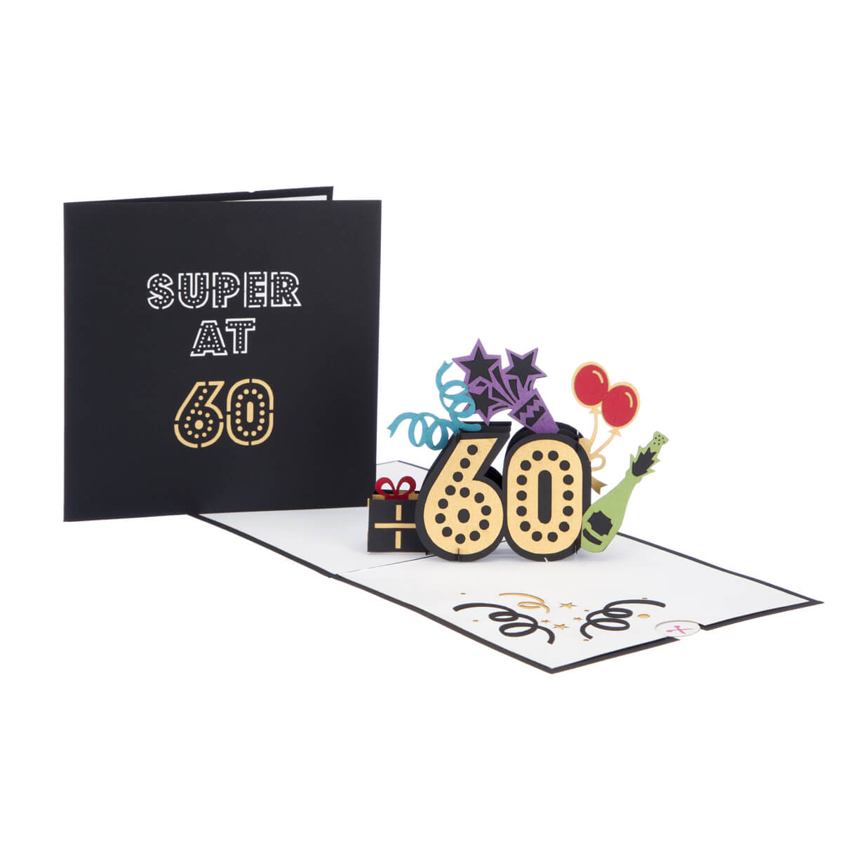 Details: It truly is what's inside that counts, each one of these Cardology 3D pop up cards hides a surprise intricate die-cut pop out inside. The Super At 60 features a delicate laser-cut 'SUPER AT 60' wording design on the front of the card and displays a hand-crafted magnificent and celebratory number 60 on the inside once opened. Each card comes flat with an envelope included Closed