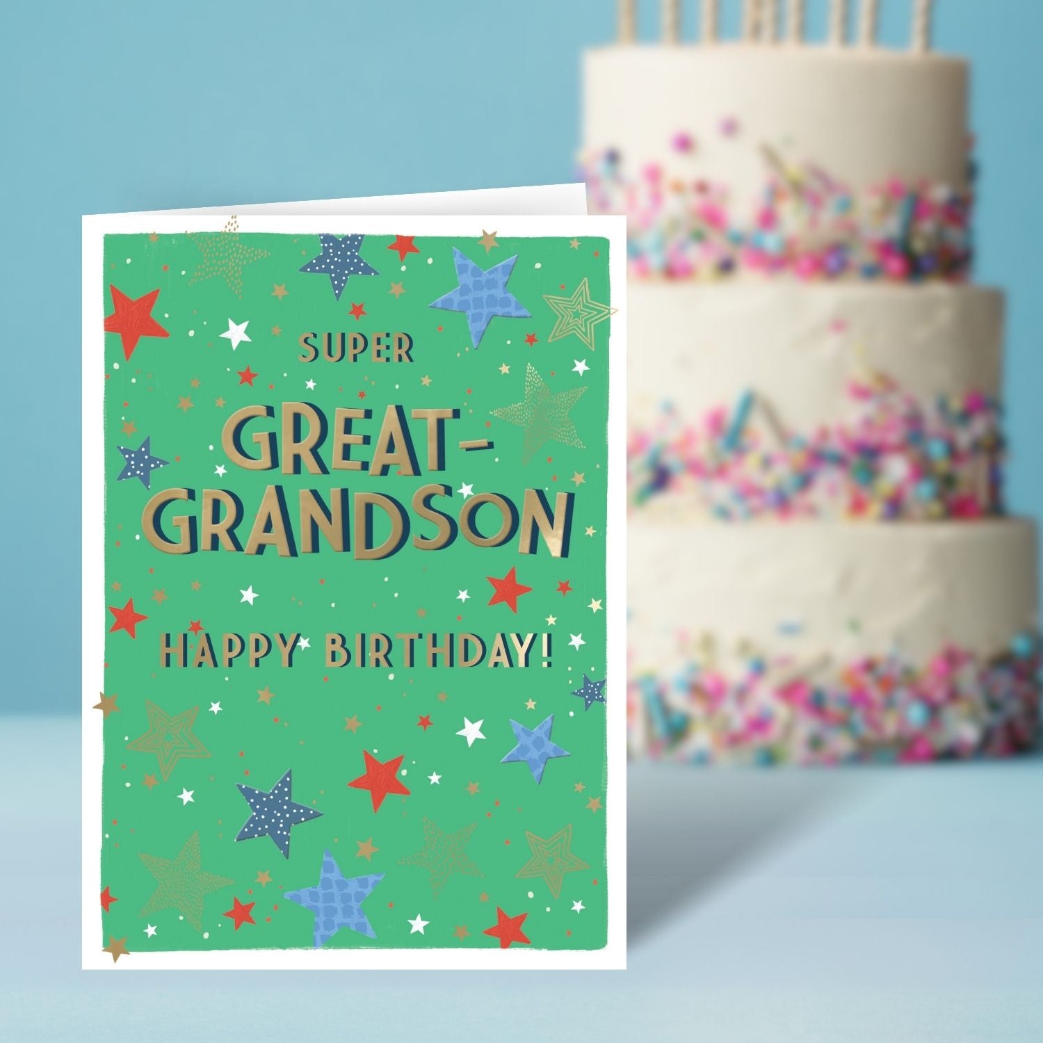 Details: This eco-friendly Contemporary Card has been thoughtfully designed as part of the Lemon & Lime range. Featuring colourful stars against a green background with the caption 'SUPER GREAT-GRANDSON HAPPY BIRTHDAY!', this foiled card is bound to make a special Great-Grandson feel bright.