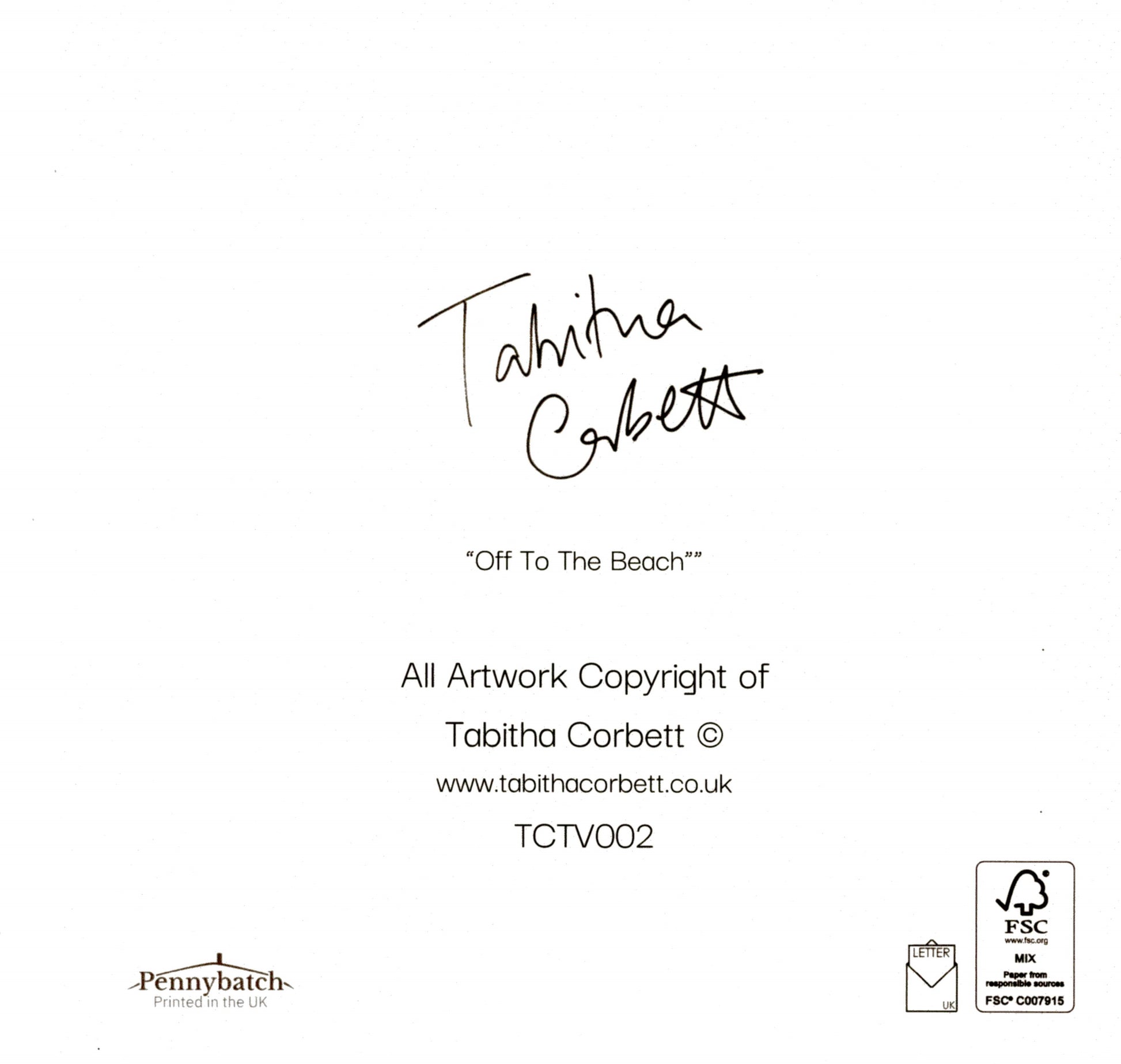 Details: This greeting card from the Tabitha Corbett Art range features a delightful beach scene with a red bucket and blue spade in the sand. The caption 'Off To The Beach' adds a cheerful touch and is sure to bring a smile to someone's face. Perfect for sending warm wishes to friends and family.