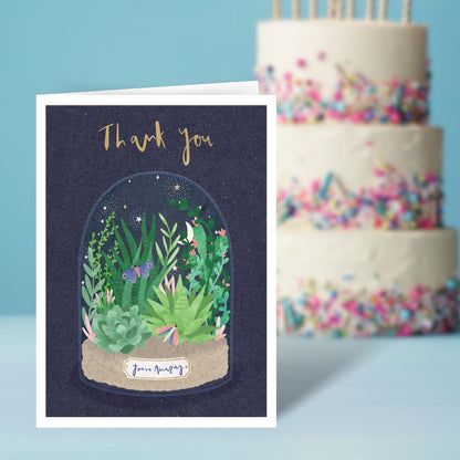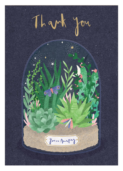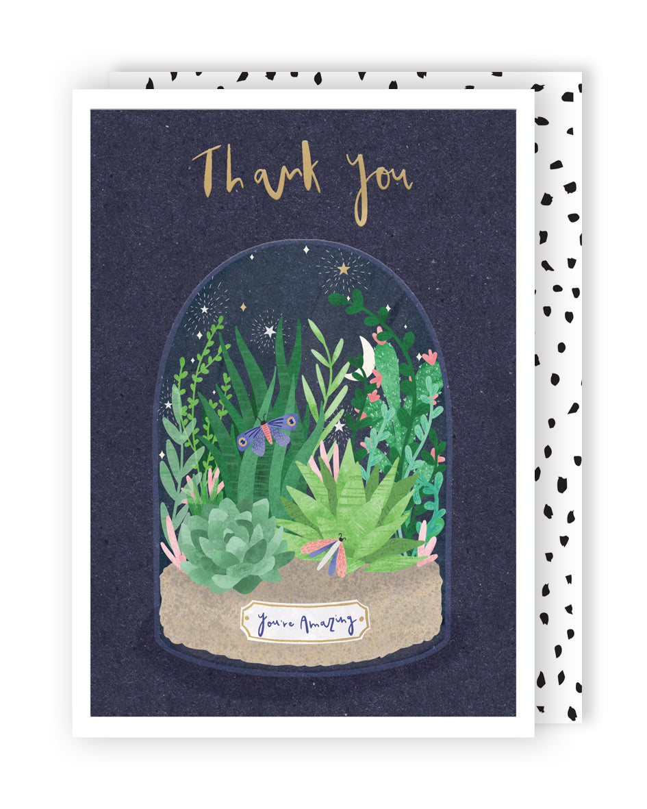 Details: This eco-friendly card from Second Nature's Lemon & Lime range is a thoughtful gesture. With a terrarium design showcasing plants and the caption 'Thank you you're amazing', this foiled card is sure to evoke heartfelt appreciation.