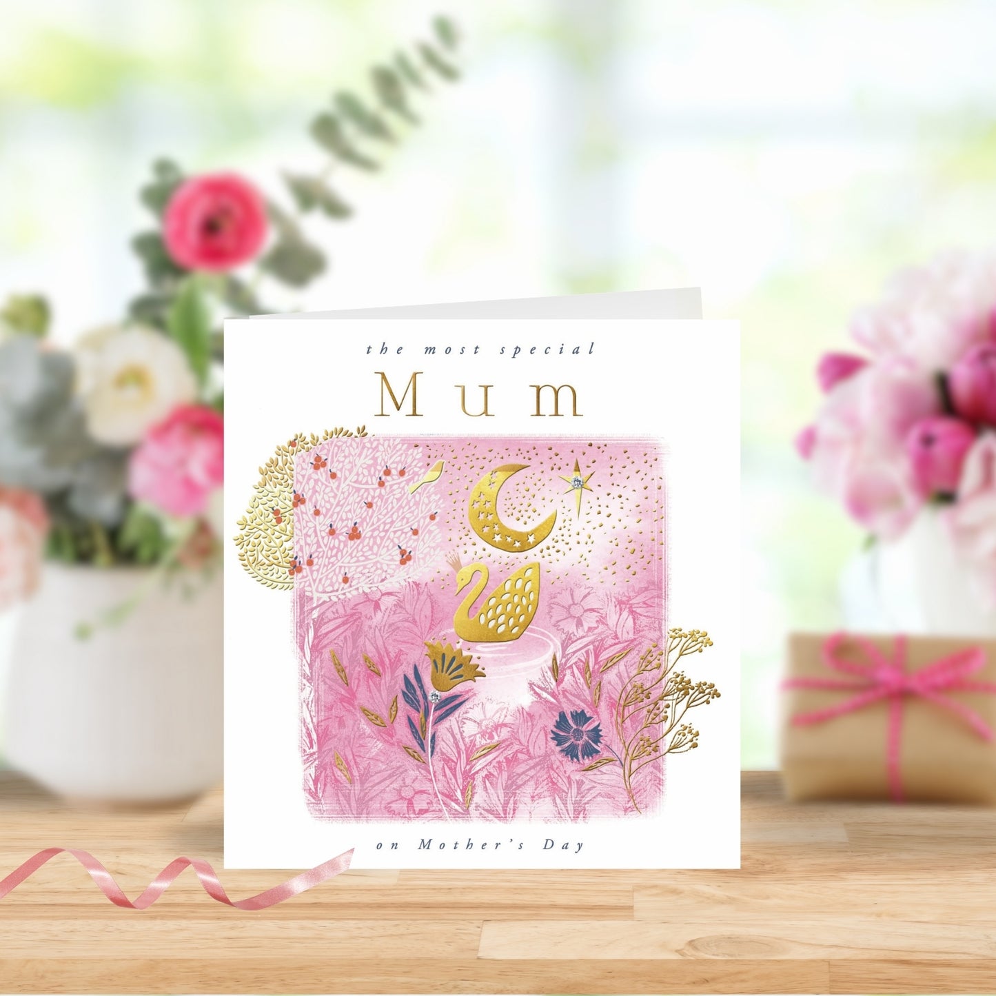 Details: A gorgeous quality Mother's Day card, featuring a delicate gold foiled swan and the finest detail from Woodmansterne