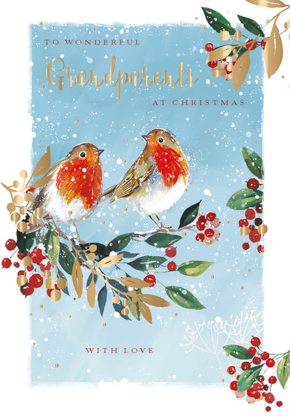 Why choose this Christmas card for your Grandparents? This beautiful robin design has been finished with golden touches to ensure their Christmas truly sparkles