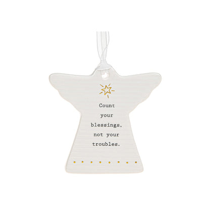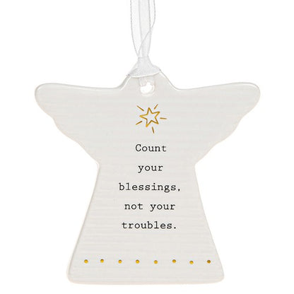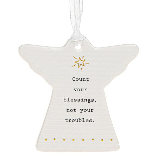 Details: A beautiful ceramic ivory coloured angel shaped hanging plaque from our sentimental 'Thoughtful Words' range. This gorgeous gift idea is finished with gold foil detailing featuring a perfectly worded sentimental message in black typeface lettering and comes in a nice craft box.
