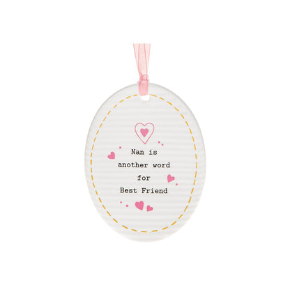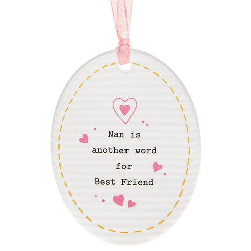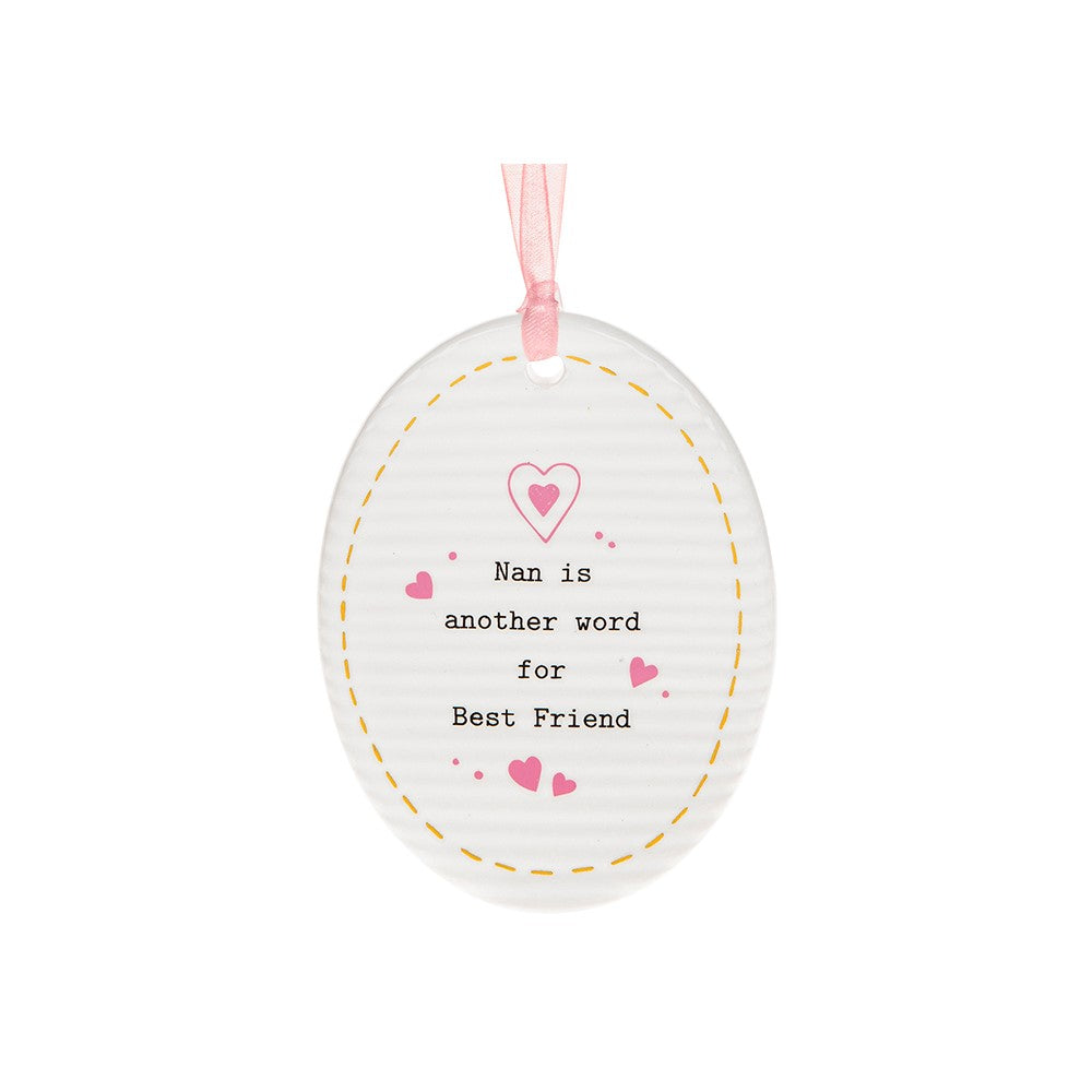 Details: A beautiful ceramic ivory coloured oval shaped hanging plaque from our sentimental 'Thoughtful Words' range. This gorgeous gift idea is finished with gold foil detailing featuring a perfectly worded sentimental message in black typeface lettering and comes in a nice craft box.