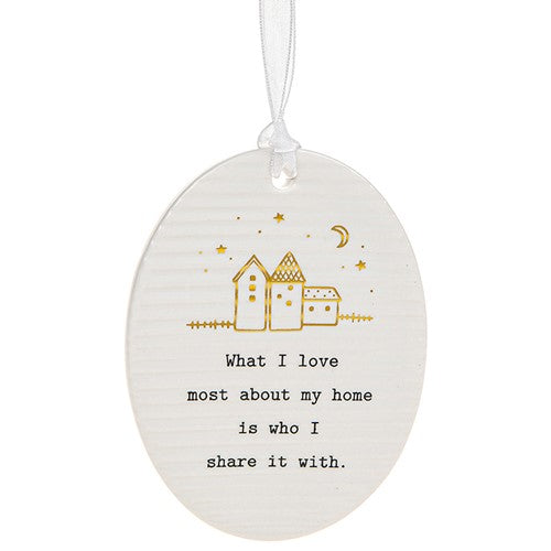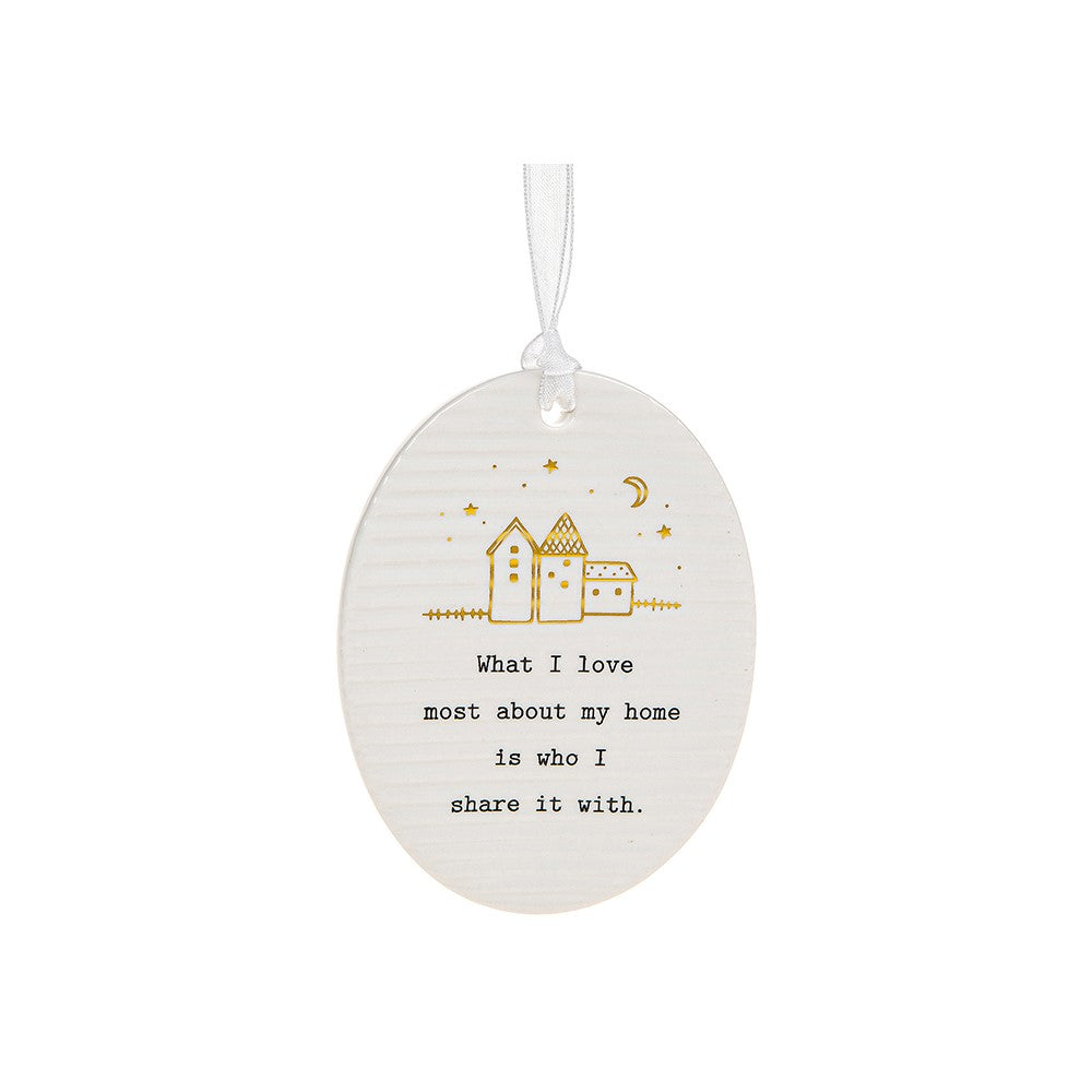 Details: A beautiful ceramic ivory coloured oval shaped hanging plaque from our sentimental 'Thoughtful Words' range. This gorgeous gift idea is finished with gold foil detailing featuring a perfectly worded sentimental message in black typeface lettering and comes in a nice craft box.