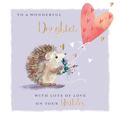 Looking for the perfect birthday card for your Daughter? Melt her heart with this super cute hedgehog-themed card that captures just a few of the special treats she deserves on her big day, balloons and flowers.