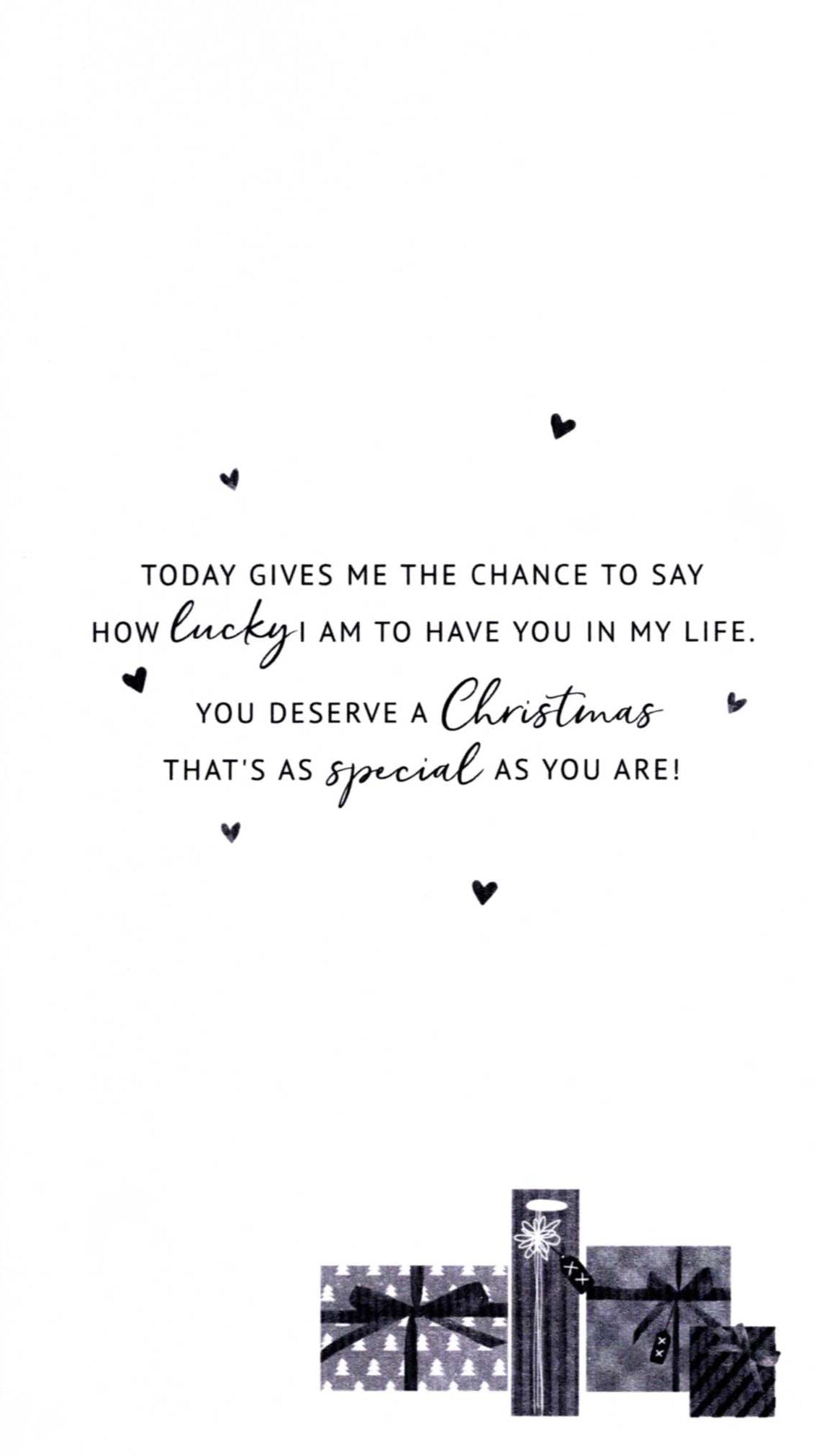 Message Inside: Today gives me the chance to say how lucky I am to have you in my life. You deserve a Christmas that's as special as you are to me!