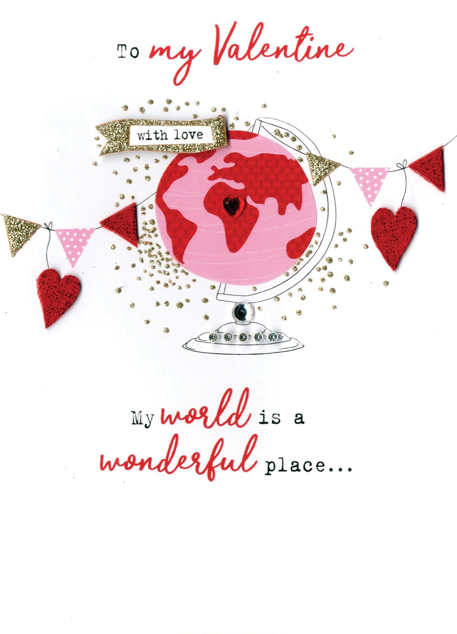 Details: A quality hand-finished embellished Valentine's Day greeting card by Second Nature featuring a pink world globe