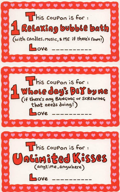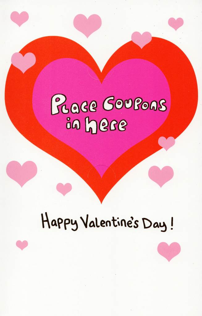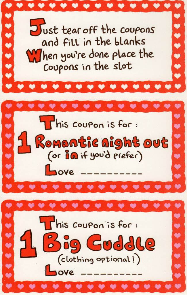 Message Inside: But just remember - though they're free, these coupons only work with me! Place Coupons Here Happy Valentine's Day! Just tear off the coupons and fill in the blanks when you're done place the coupons in the slot, This coupon is for 1 Romantic night out (or in if you prefer). This coupon is for 1 big cuddle (clothing optional) This coupon is for 1 relaxing bubble bath (with candles, music & me if there's room). This coupon is for a whole days DIY by me (if there's banging or screwing that needs doing). This coupon is for unlimited kisses (anytime, anywhere)