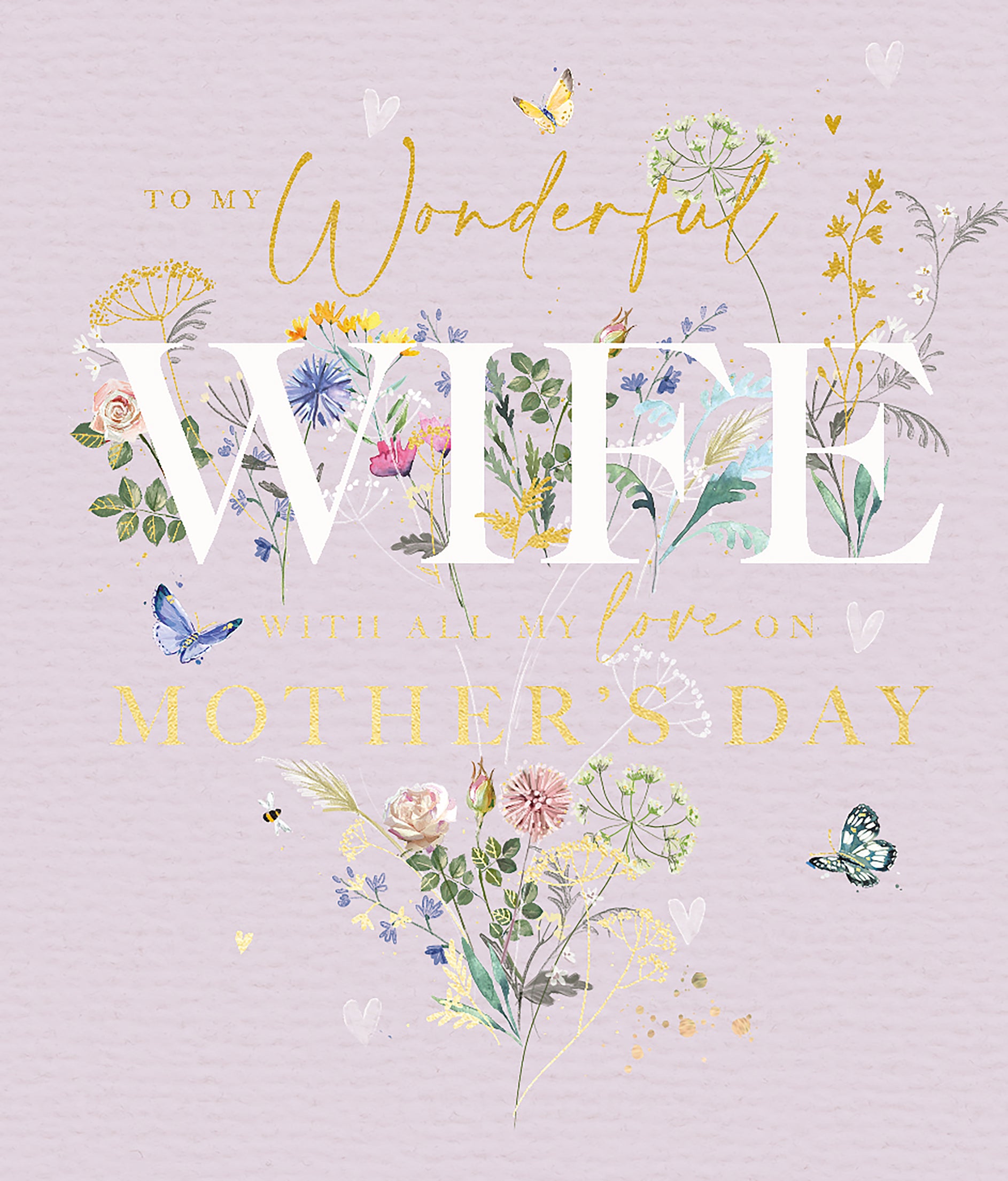 Looking for greeting card ideas for her? Receiving this breathtaking, eco-friendly greeting card featuring wildflowers and butterflies would make any wife feel cherished and appreciated. The word 'wife' reminds her of your love, while the stunning artwork captures the beauty she brings to your life. A perfect way to surprise her on Mother's Day.