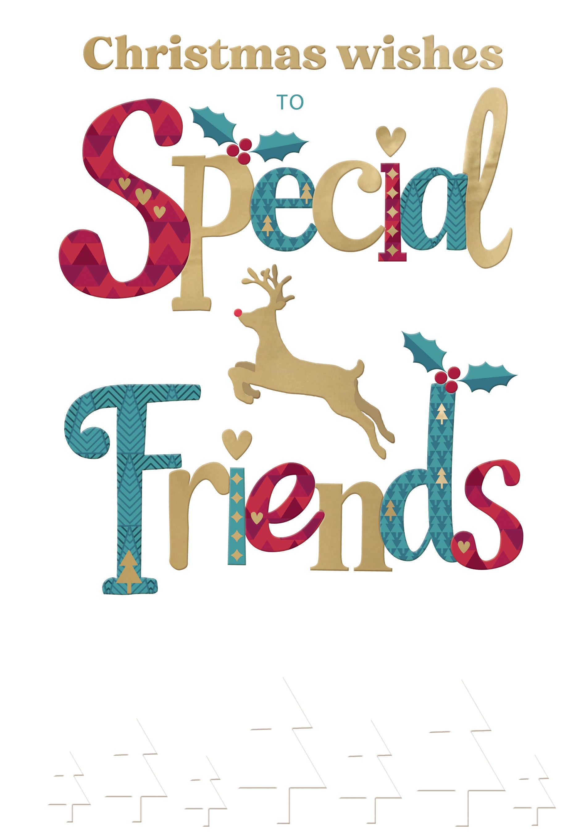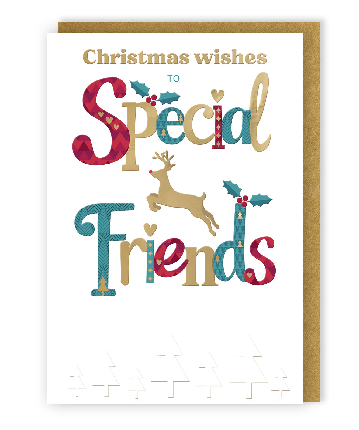 Looking for greeting card ideas for friends? This stylish eco-friendly greeting card captures joyful moments with patterned foiled special friends lettering and an embossed detailing. It's perfect for celebrating special friendships at Christmas time and spreading festive cheer and love.