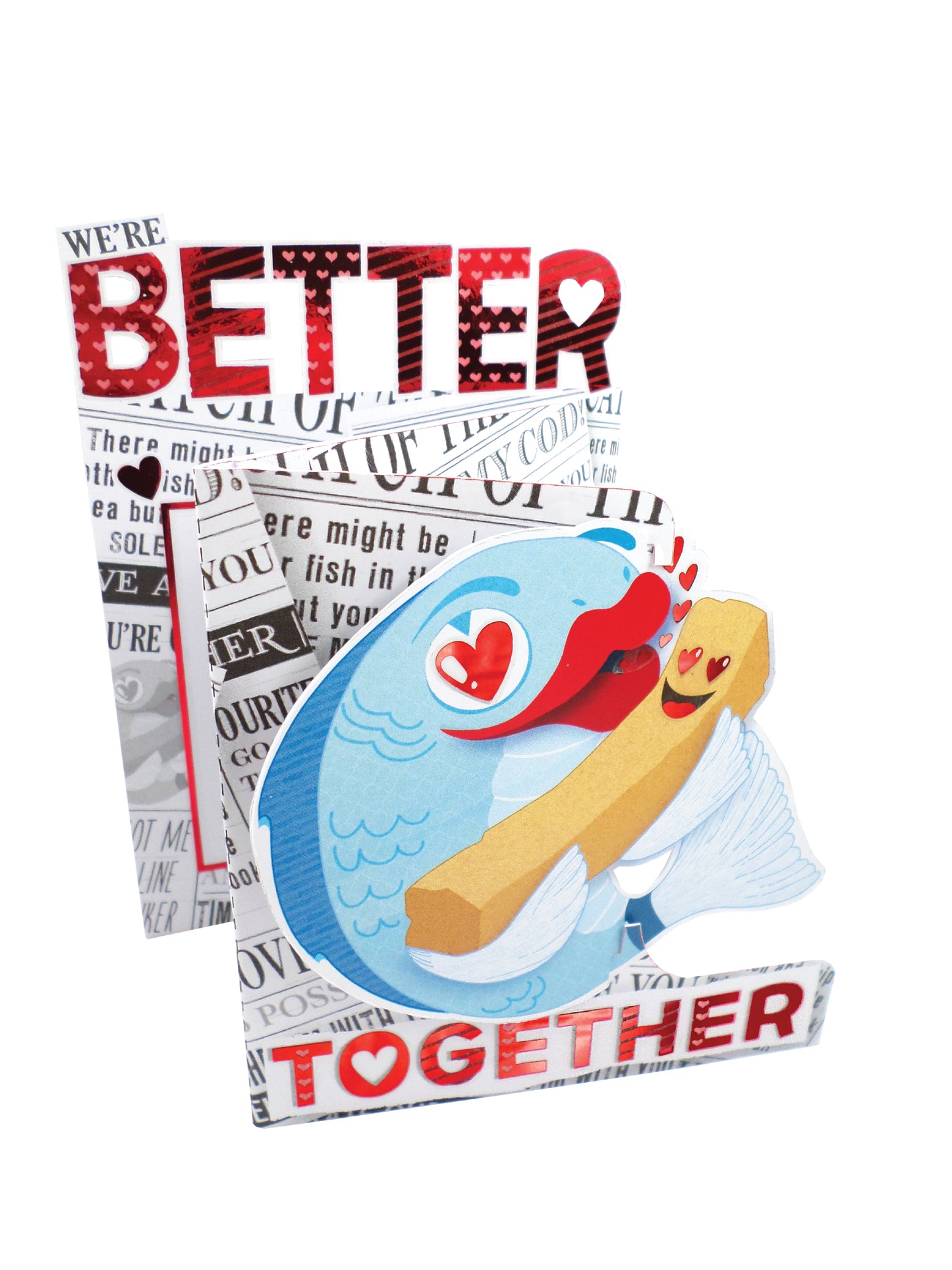 Details: A 3D freestanding fold-out cutting edge Valentine's Day greeting card by Second Nature featuring a loved-up fish and a chip