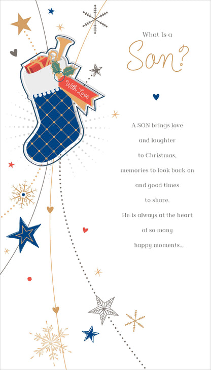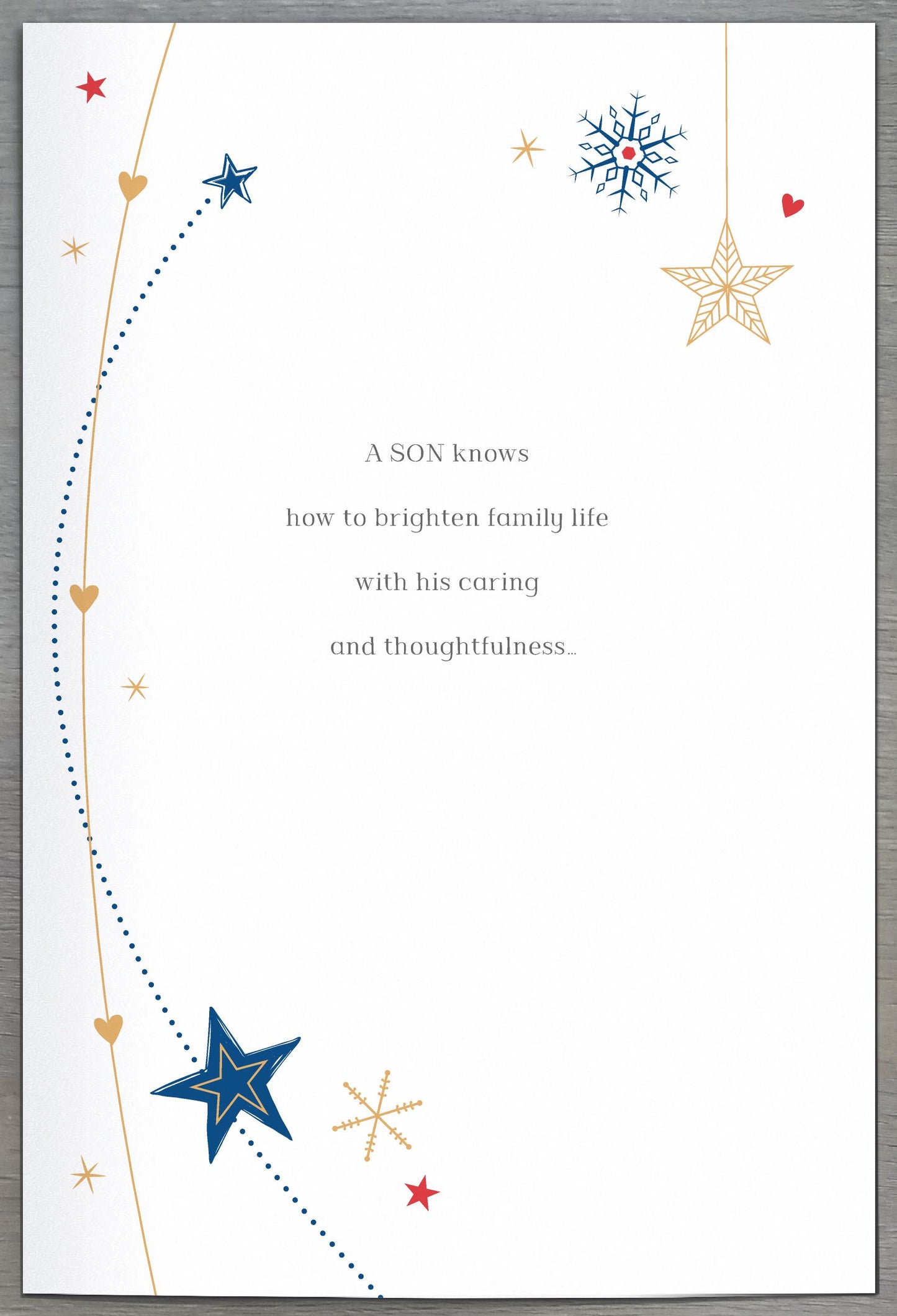 Message: A son knows how to brighten family life with his caring and thoughtfulness… …and he is someone to forever be proud of and appreciate for all he does… Above all, a SON is someone you love more as every year goes by. Merry Christmas to a Wonderful SON