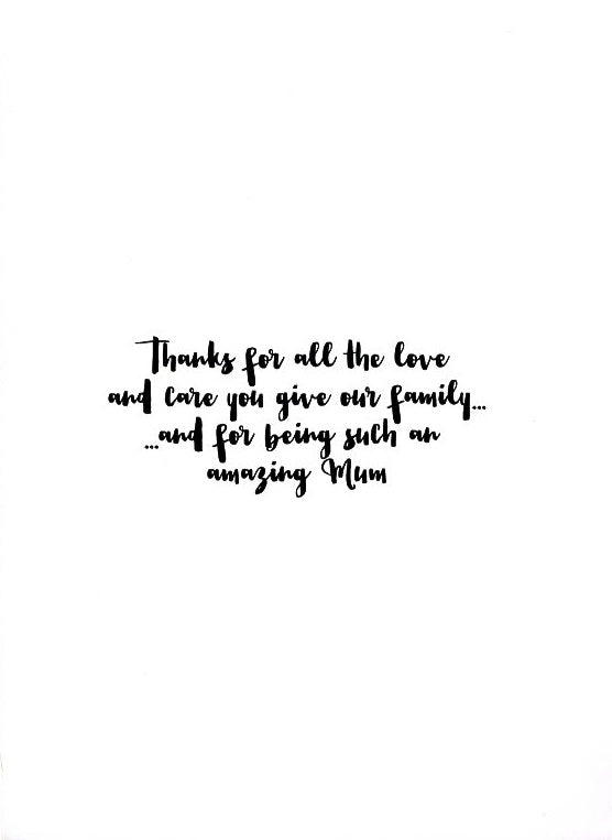 Message: Thanks for all the love and care you give our family… …and for being such an amazing Mum