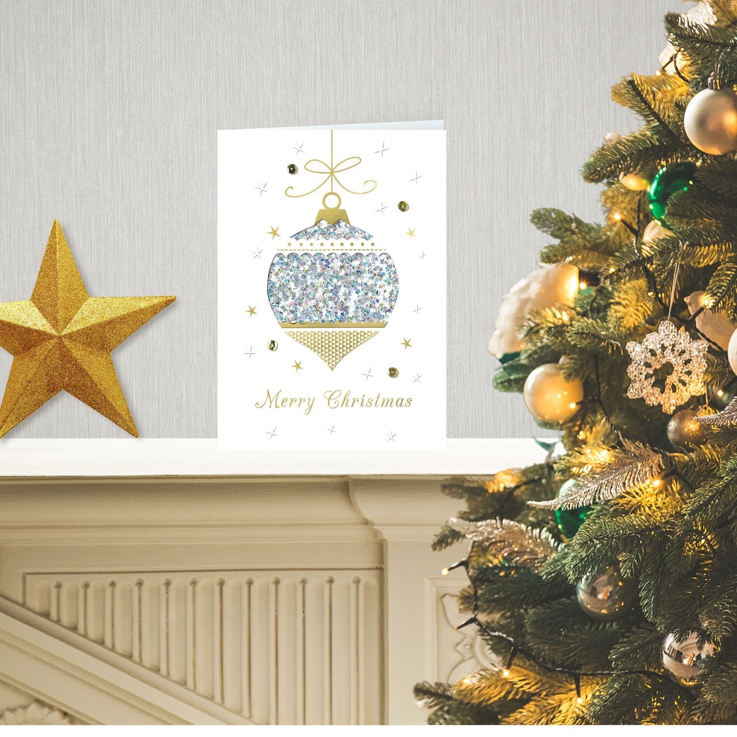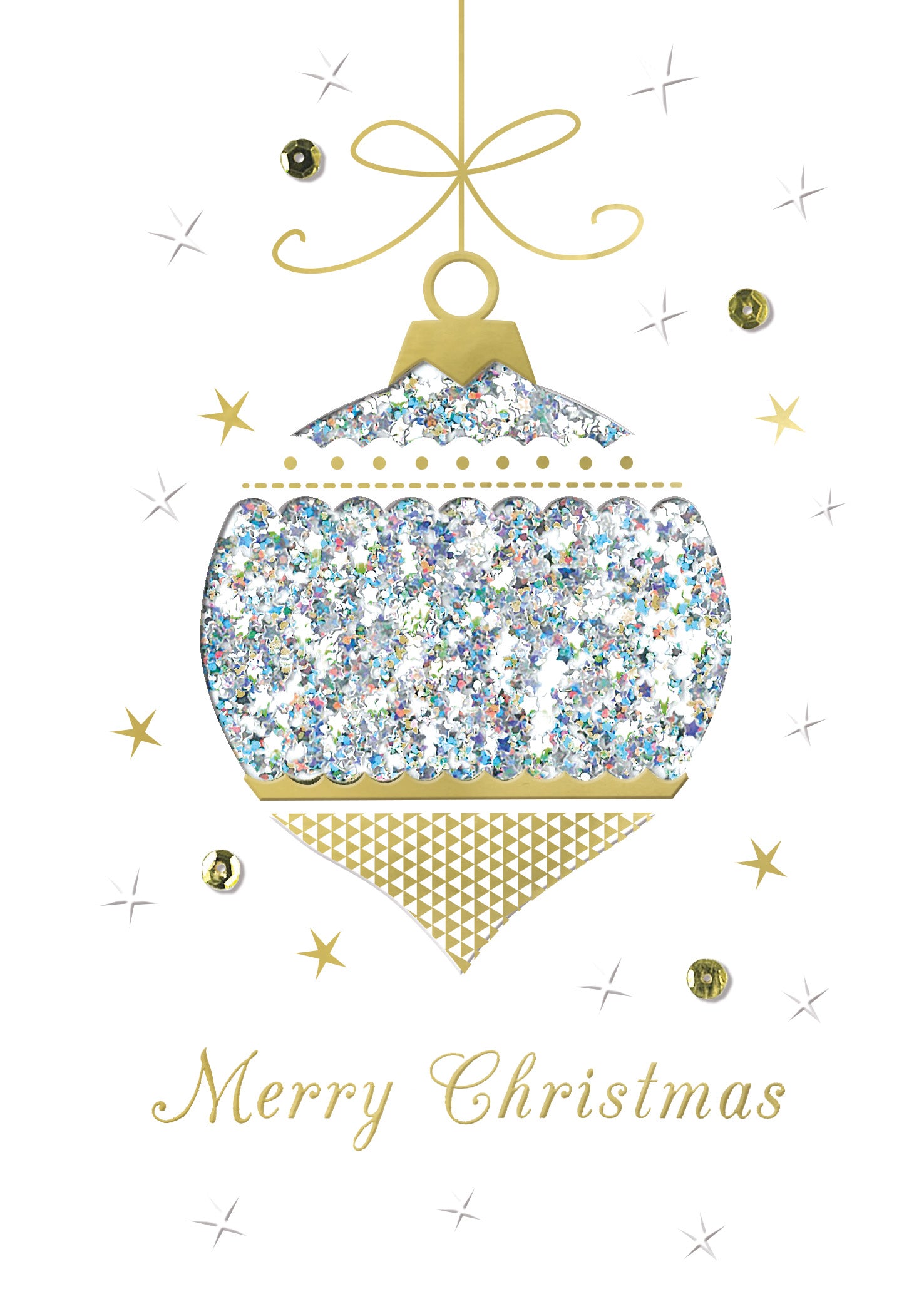 Details: This charming, hand-finished Christmas card from Second Nature's Winter Glow collection is adorned with a delicate bauble filled with tiny silver stars and gold foiling with the caption 'Merry Christmas'.