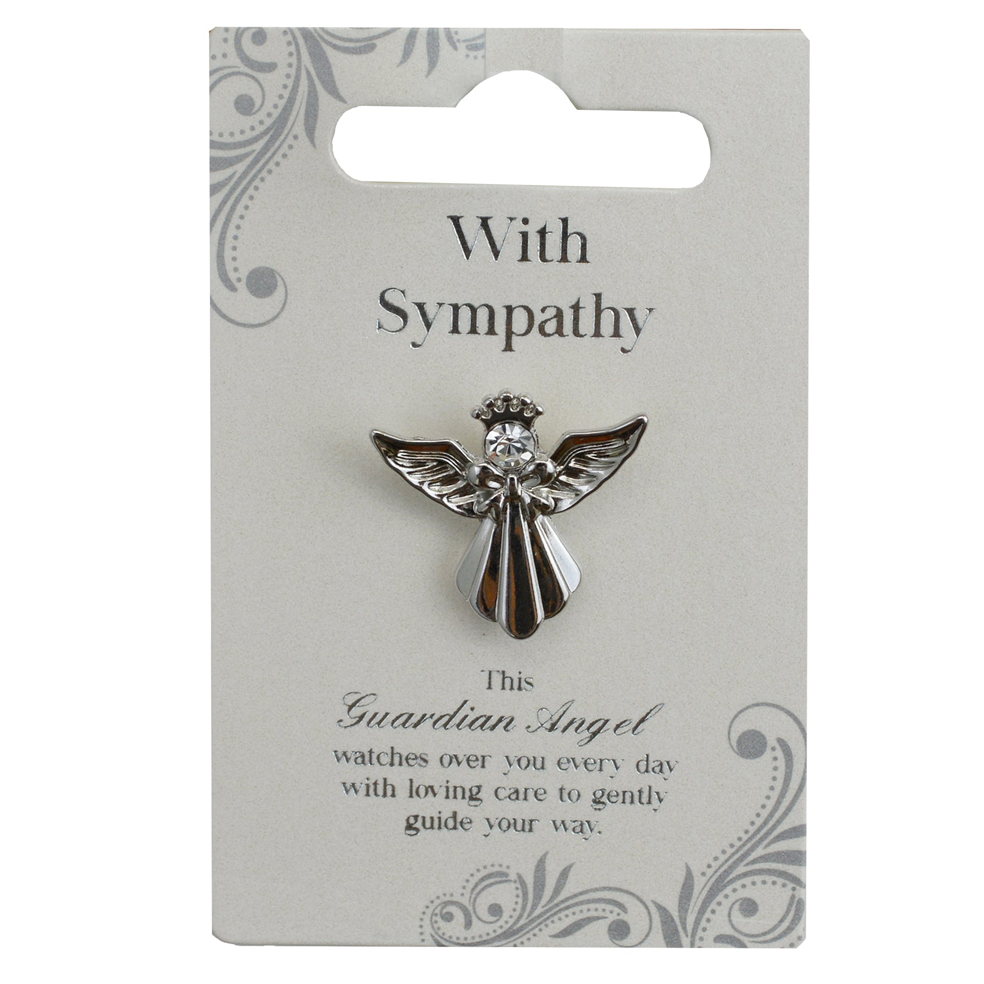 Details: A silver coloured angel pin presented on a backing card