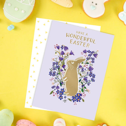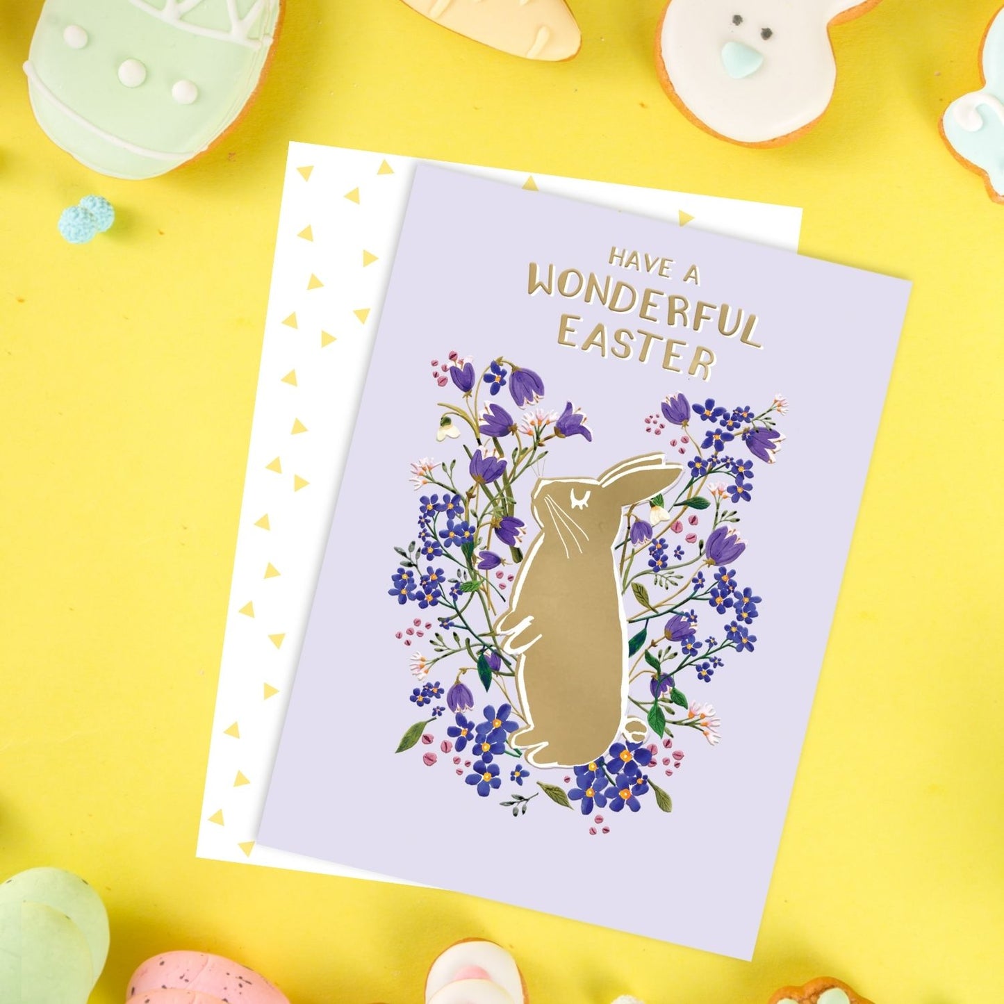 Details: Celebrate Easter with a touch of nature by sending Second Nature's eco-friendly Bunnies & Blooms card. With its charming design of a golden rabbit in a vibrant purple meadow, this foiled card is sure to bring joy to your loved ones' special occasion.