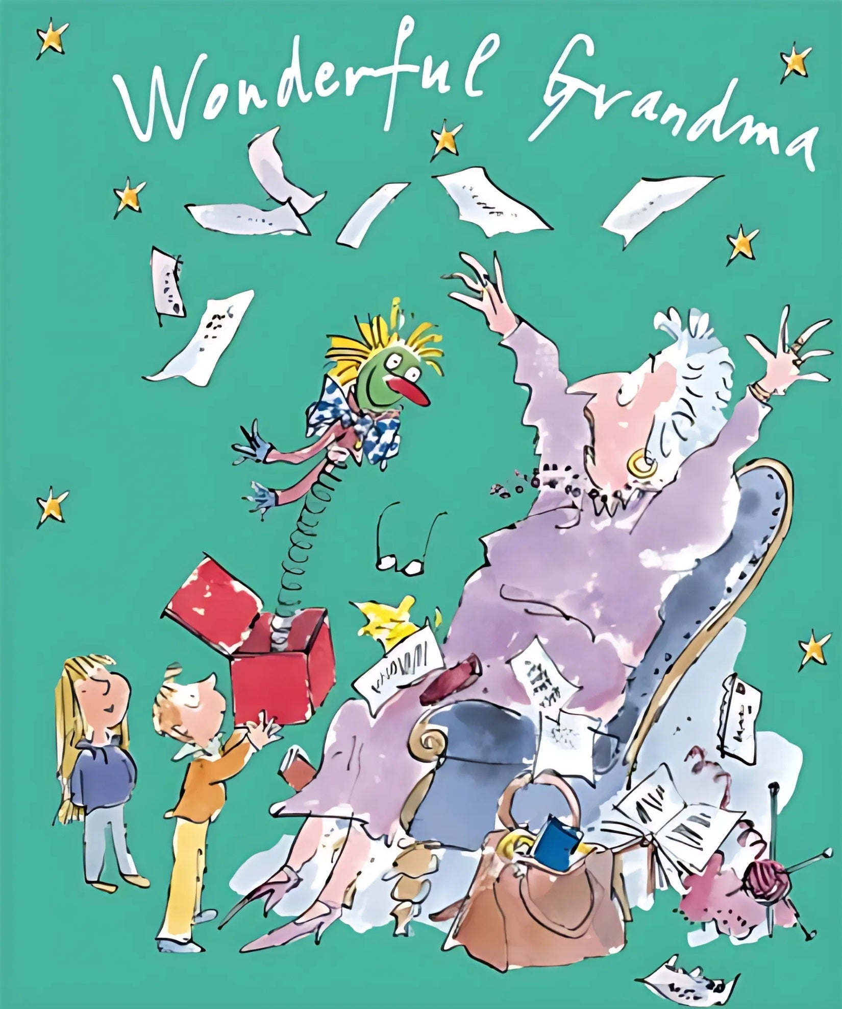 Details: A popular greeting card from Britain's best-loved illustrator Quentin Blake featuring an amusing illustration of cheeky grandchildren pranking Grandma