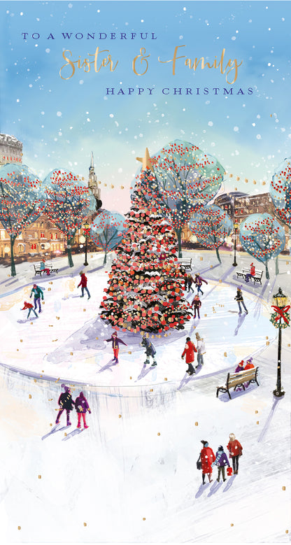 Why choose this Christmas card for your Sister & Family? This snowy ice-skating design captures the excitement of the holiday season, perfect for sending Christmas spirit straight to their door