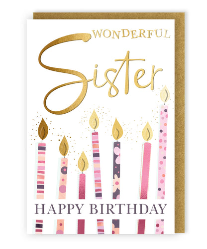 Details: This eco-friendly Contemporary Card from Second Nature's Impressions range is designed with birthday candles, patterns, and a gold flame. With the caption 'WONDERFUL Sister HAPPY BIRTHDAY,' this embossed card will bring joy to a special Sister.